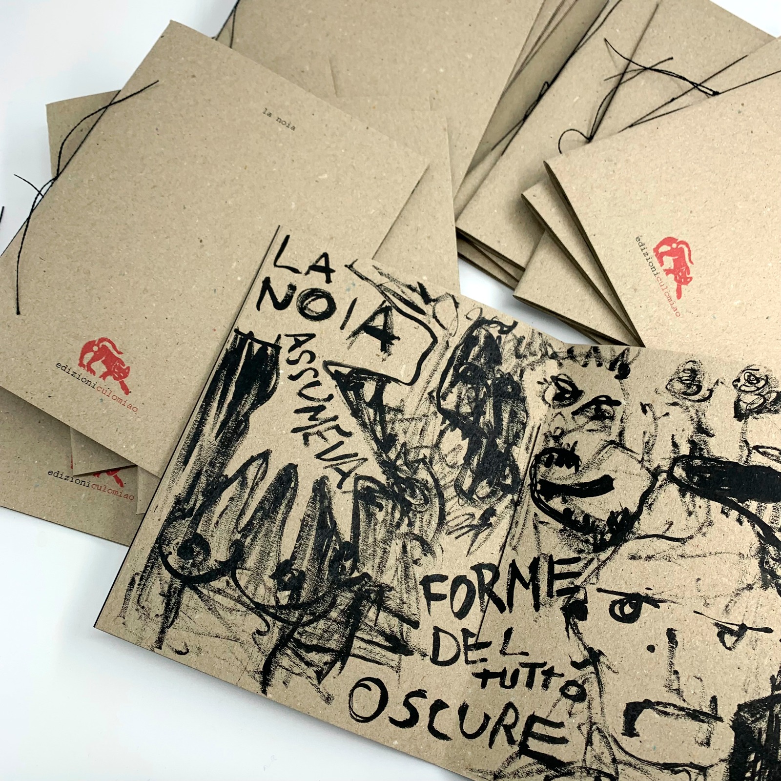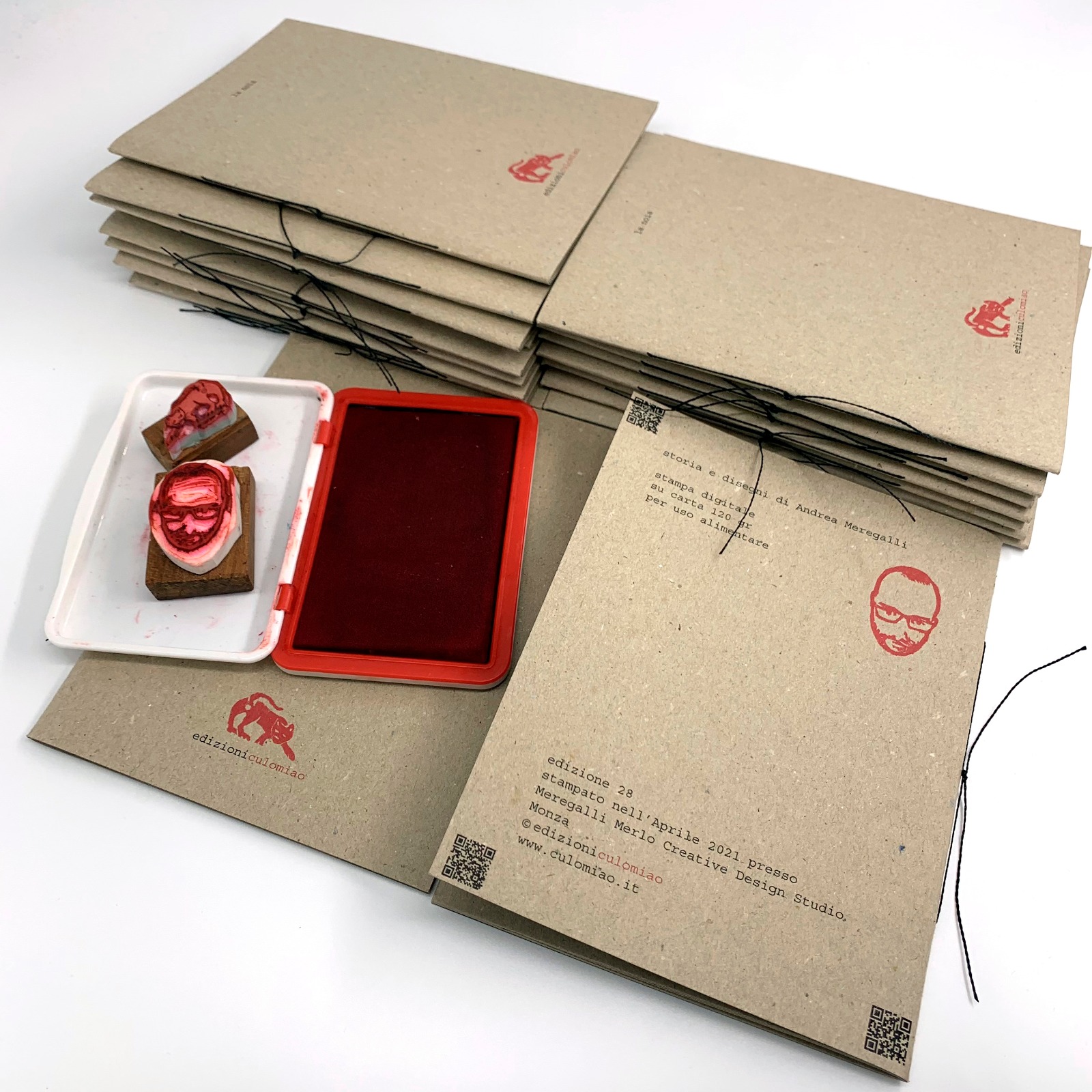 I libri sono confezionati rigorosamente a mano, stampati su carta paglia per tovagliette ad uso alimentare, timbrati e numerati.