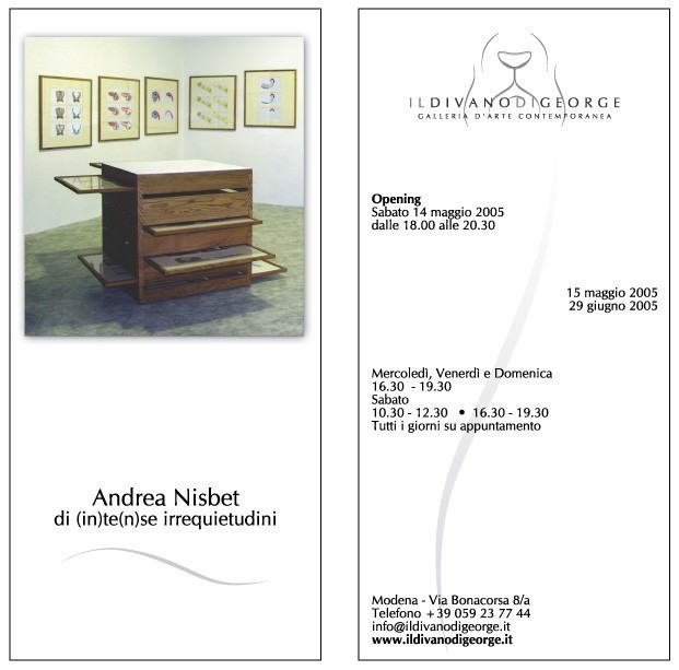 La Galleria Il Divano di George - Modena è lieta di invitarVi all'opening della mostra di Andrea Nisbet, che si terrà sabato 14 Maggio 2005 dalle 18.00 alle 20.30 presso il nostro spazio di Via Bonacorsa 8/a.