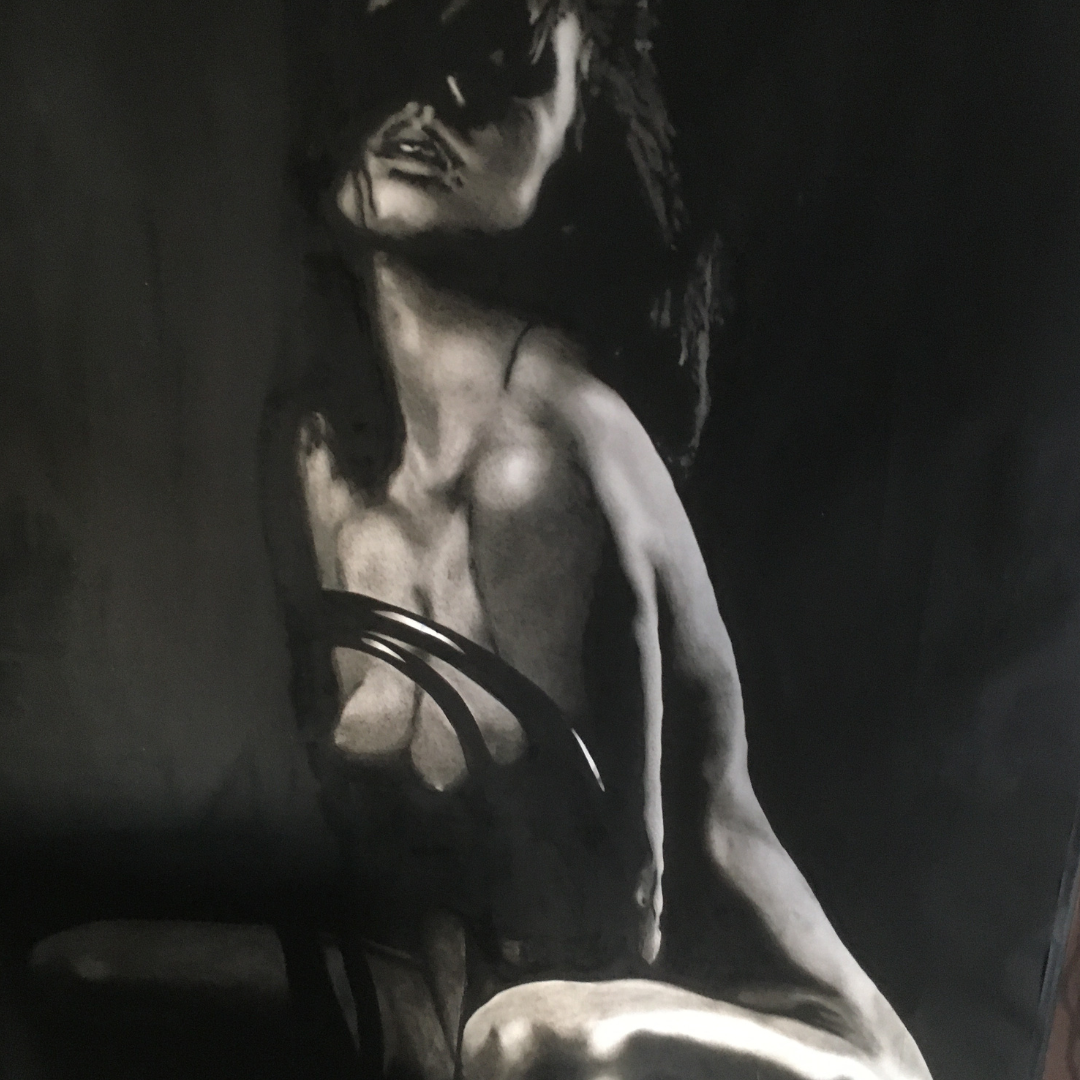 È l’istinto a guidare l’artista, che senza partire da un disegno preparatorio, ma optando per una base di partenza scura, lascia man mano determinate zone in luce in modo da esaltare la figura finale attraverso un perfetto gioco di luci e ombre, chiaro e scuro.