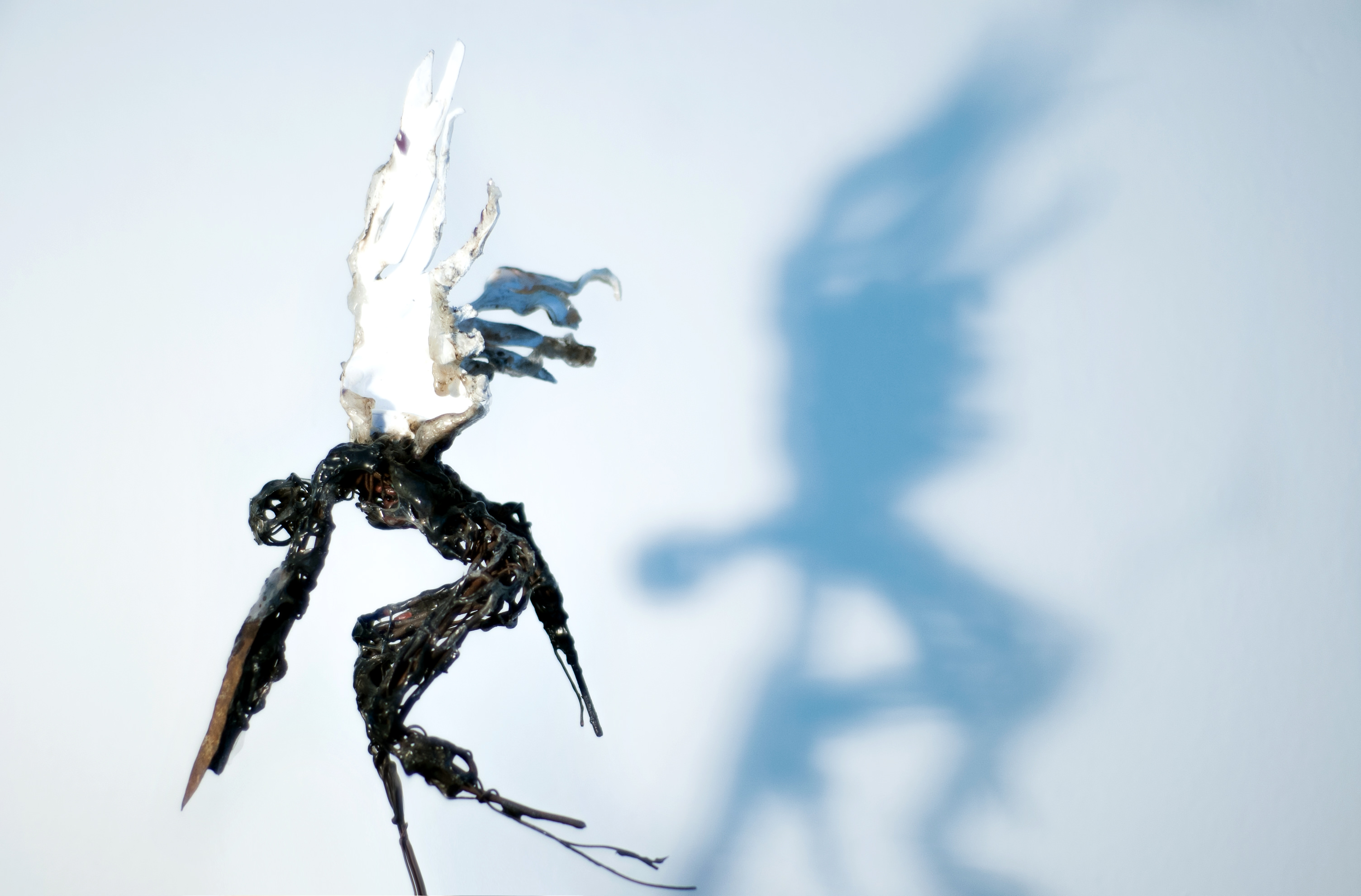 Le sculture sono modellate di fuoco in fiamme e cristallizzate nella forma e nell’attimo in cui risorgono a nuova vita. Figure mitologiche realizzate grazie a una sapiente e sperimentale fusione di materiali di scarto quali ferro, alluminio, plastica, resina e cere.