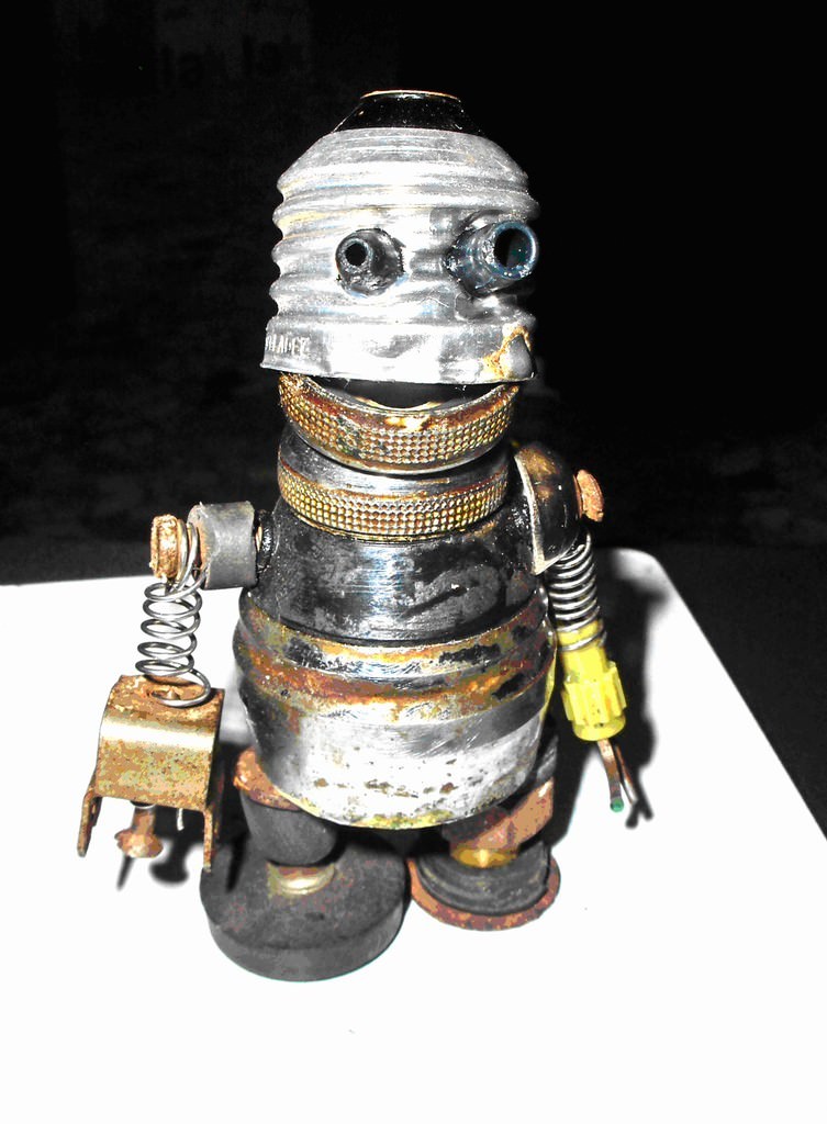 Ogni robot dell’artista racchiude emozioni quasi umane… su ogni bullone o pezzo di latta si può scorgere lo scorrere del tempo, e le loro avventure sono tatuate come cicatrici di guerrieri dell’universo, in un futuro remoto di autodistruzione, in cui la nostra anima sopravvive solo nel cuore metallico di questi scarti assemblati dall’uomo.