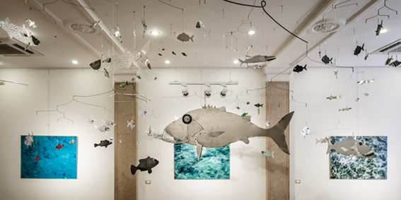 Grandi occhi, linee spezzate, branchie, squame, pinne, mandibole mobili e non, animano le sagome di pesci reali e fantastici. Grazie a lievi correnti d’aria, si muovono in gruppi compositi o in solitudine, come in una danza, portando l’osservatore a immaginarsi abitante di una realtà sottomarina.