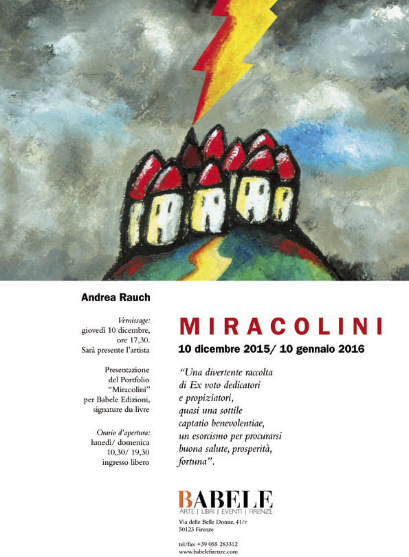 Dal 10 dicembre 2015 al 10 gennaio 2016 saranno esposti alla Galleria Babele una trentina di opere in tecnica mista, fra dipinti e sculture, che dimostrano una volta di più come l’estro creativo e la tecnica raggiungano un connubio perfetto nell’arte di Rauch e trovino una simpatetica esplicitazione in questi Ex-voto, tenere testimonianze di amore divino, meschinità umana, piccoli drammi e bizzarre illusioni.