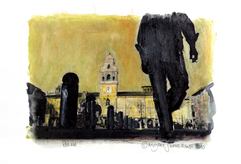 «Intenso e profondo – scrive il curatore – è il rapporto che Andrea Samaritani intrattiene, da tanti anni, con la fotografia: il suo sguardo ha cercato di catturare immagini del “Bel Paese”, di andare alla scoperta di itinerari culturali insoliti, di rivelare i segreti di studi d’artista e di opere d’arte antiche e moderne. Dodici anni fa, Andrea si è avventurato in un’esperienza, intensificatasi nel tempo, che riunificasse la sua duplice passione per la fotografia e per la pittura, cominciando a stendere colori sulle sue immagini stampate su carta. Ecco riunite, in questa mostra, alcune delle visioni con le quali Samaritani sembra essersi impegnato in una sorta di aggiornamento dei portolani del Grand Tour italiano, sulle orme dell’incanto che sedusse aristocratici e intellettuali europei dal Seicento in poi. In verità, Andrea ci propone una revisione di alcune delle immagini che fondarono il mito della bell’Italia nella cultura d’Europa, che per lui ora s’incarna nella fusione delle piazze silenti, metafisiche, contese tra la luce e l’ombra, di Giorgio de Chirico, e delle figure scarnificate di Alberto Giacometti, che l’artista di Stampa percepiva come una visione che s’assottigliava fin quasi a dissolversi nel vuoto».