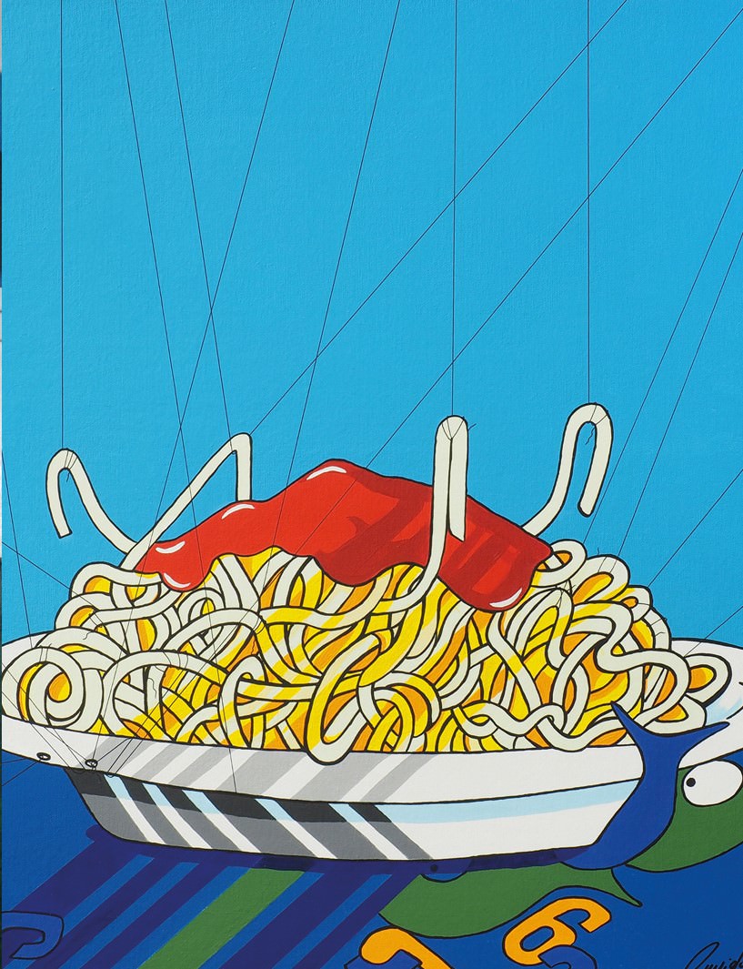 La linea in una performance liquida tra le onde segna l'arte di ANDREA SANGALLI che, creando, sorride ironicamente al mondo sfidandolo in una risata triste. La favola cromatica dei pesci fuor d'acqua racconta queste creature in continuo mutamento, impegnati a progettare sempre nuovi incontri/forme in un susseguirsi continuo di fantastiche e imprevedibili visioni. Dai sogni infantili agli amari scherzi della realtà, l'opera di Sangalli è una boccata d'ossigeno, una visone sopra le righe per il naufrago quotidiano che, immerso nel mare di infinite immagini colorate e digitalizzate, perde spesso la rotta e vaga come un pesce fuor d'acqua ….. Una cifra stilistica dinamica e spensierata da forma a una riflessione impegnata e impegnativa sull'esistenza intesa come una navigazione, attualmente associata a un navigare nella rete e non nel mare, a un vivere connessi e non liberi verso una meta incostante, in continuo upload ….Io non parlo di un fragile legame tra due nomi/Né di un vincolo nelle pagine lise di un registro./Io parlo dei miei voluttuosi capelli/E degli ardenti papaveri dei tuoi baci,/Dell’intimità clandestina dei nostri corpi/E della nostra nudità che riluce/Come le squame dei pesci nell’acqua. (Forugh Farrokhzad)