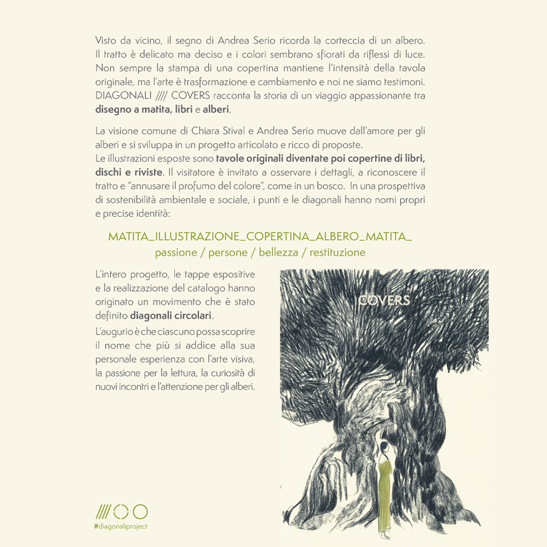 Il senso celato del progetto si spinge oltre l’arte in sé -come spiegano Andrea Serio e Chiara Stival, curatrice del progetto- perché desidera promuovere l’arte a sostegno della sostenibilità sociale e ambientale. I disegni di Serio a matita dedicati agli alberi, paragonabili a veri e propri ritratti, sono molto apprezzati sia per la tecnica sia per le emozioni che riescono a evocare. Proprio da questa passione per la natura e il paesaggio, condivisa con la curatrice del progetto, scaturisce il bisogno di coinvolgere il pubblico in uno dei temi di maggiore portata del nostro presente, il cambiamento climatico. Può il singolo intervenire per ridurre gli effetti di questa trasformazione globale? Andrea Serio e Chiara Stival ne sono convinti e hanno scelto di cogliere l’occasione data dall’esposizione artistica per fermarsi a riflettere sulle questioni ambientali, non solo con le parole ma anche con azioni concrete. Nasce in questo modo il nome del progetto-mostra DIAGONALI////COVERS, per mettere in connessione l’arte con la natura, come le diagonali, linee che congiungono punti distanti tra loro, linee dritte che possono diventare circolari e stimolare nuovi processi creativi: un disegno a matita diventa la copertina di un “oggetto” che contiene parole e musica, così un progetto può permettere la messa a dimora di nuove piante.