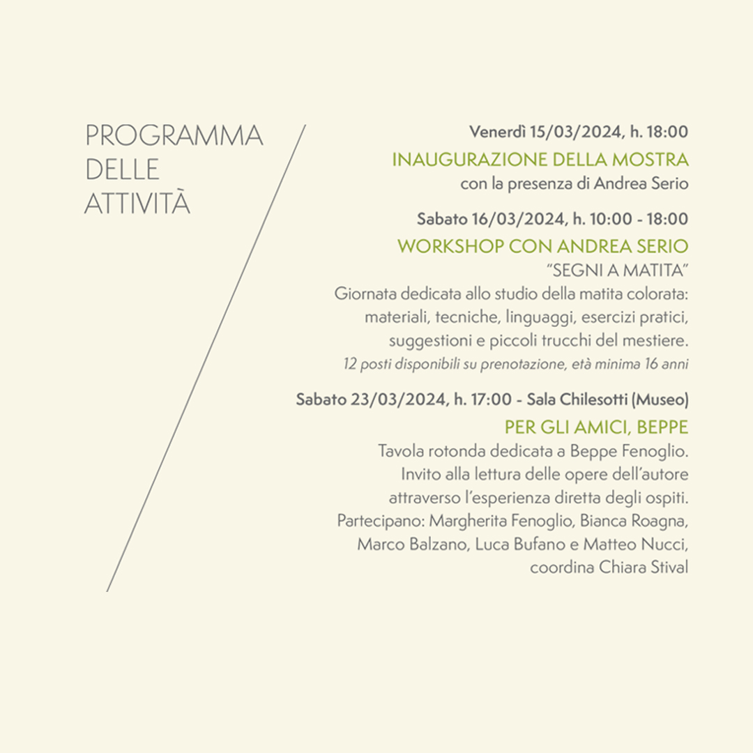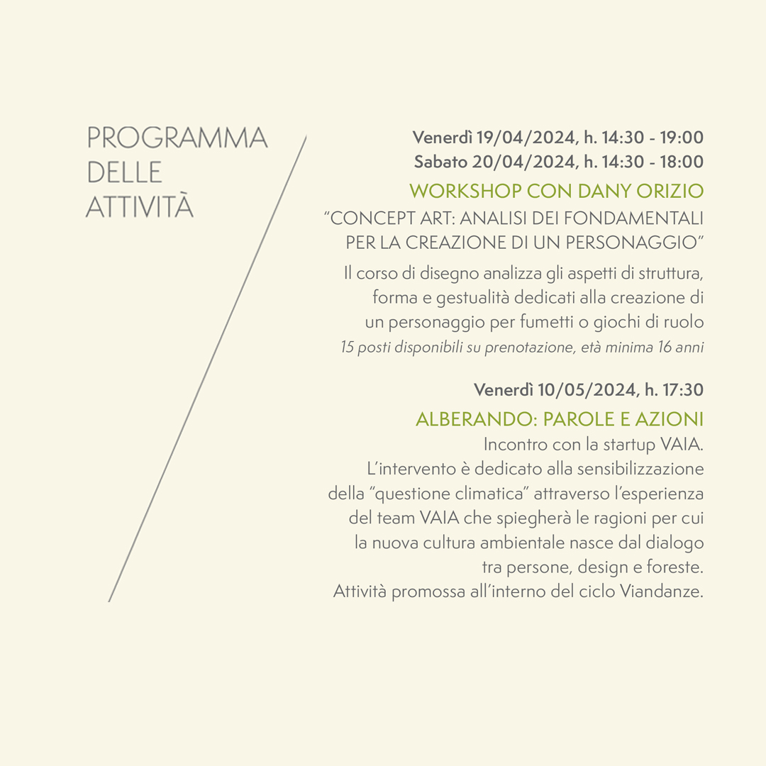 L’arte è indubbiamente forma di espressione che può ricercare la bellezza, ma è anche strumento potente di diffusione di una cultura sociale e ambientale; per questo l’idea di Serio e Stival si articola proponendo in ogni tappa diverse attività contemporanee alla mostra, come workshop, incontri con scrittori e serate di sensibilizzazione alla sostenibilità. Nella tappa bassanese, infatti, ci saranno due workshop, uno dedicato all’illustrazione a matita, tenuto dallo stesso Andrea Serio (16 marzo) e un altro di concept art, tenuto dall’illustratore bresciano Dany Orizio (19-20 aprile); sabato 23 marzo si terrà un incontro dedicato a Beppe Fenoglio, uno degli scrittori più importanti del Novecento italiano, con la speciale partecipazione della figlia, Margherita Fenoglio, oltre a Bianca Roagna, direttrice del Centro Studi Beppe Fenoglio di Alba e tre degli scrittori che hanno curato le nuove edizioni delle opere dell’autore per Einaudi, Luca Bufano, Marco Balzano e Matteo Nucci. Infine, uno dei fondatori di VAIA incontrerà il pubblico venerdì 10 maggio per parlare di sostenibilità ambientale e raccontare l’esperienza dell’ideazione di vaia cube per la riforestazione dopo la tempesta del 2018.