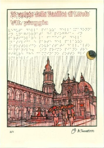 Le vedute di Andrea Sòcrati si distaccano da tutte quelle precedenti per la tecnica e la finalità: essa è infatti mutuata dai sistemi con cui si realizzano i disegni a rilievo per le persone non vedenti. Con particolari accorgimenti è stata evidenziata la potenzialità estetica di tale tecnica unendo così la forza della visione ai valori della tattilità. Nel dettaglio, si parte da una fotografia che poi viene disegnata e rielaborata al computer manualmente e poi ancora poi viene stampata in rilievo con colori a mano. Il profilo della Basilica della Santa Casa, appare nelle immagini di Socrati immersa nel verde e nella natura, oppure assalita da ridenti vigneti, o contaminata dalle palme. Ma ci sono anche vedute del sacro, come quelle delle processioni. Tutti elementi che fanno di Loreto un luogo dove la religiosità invade e determina il paesaggio.