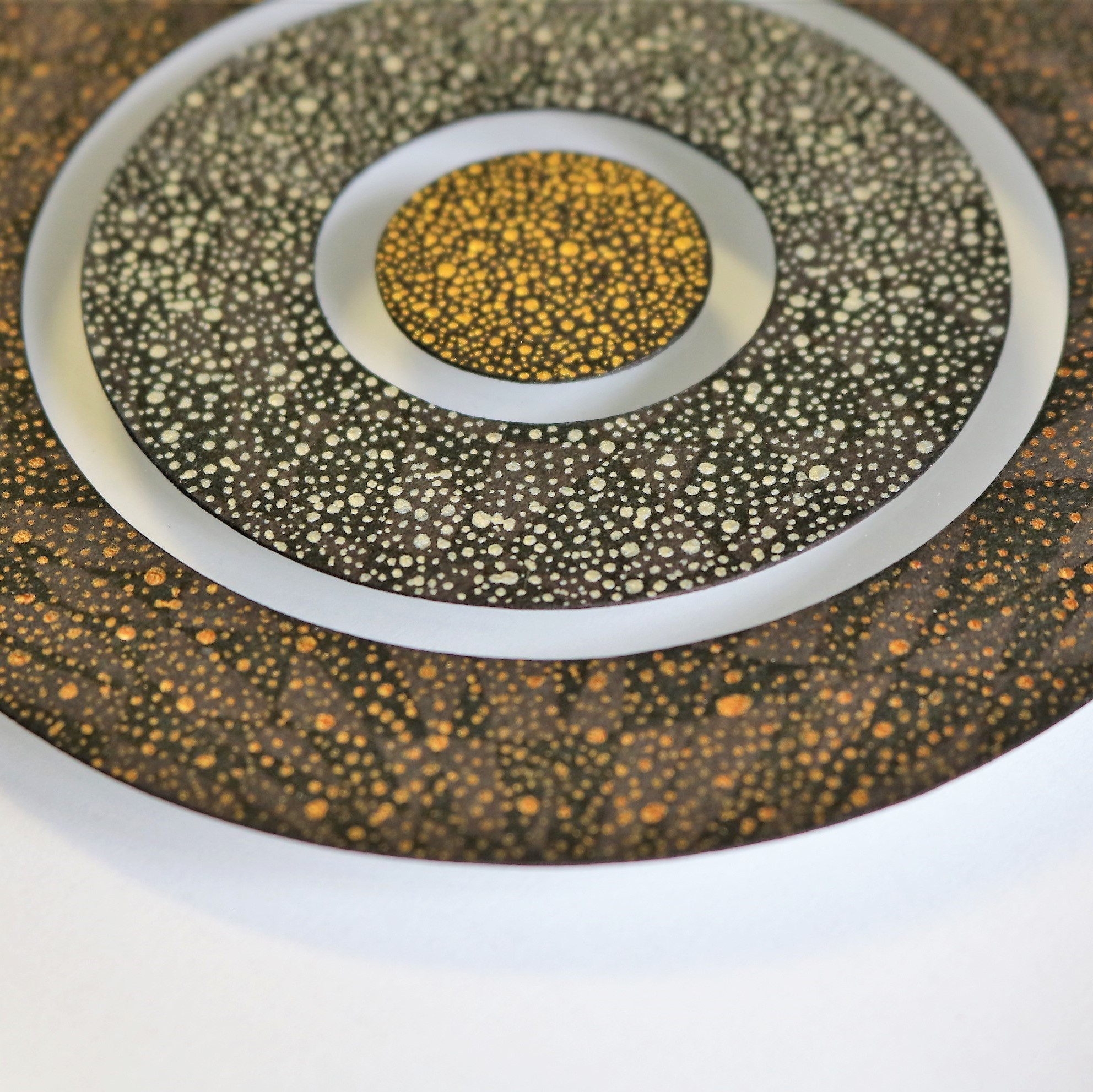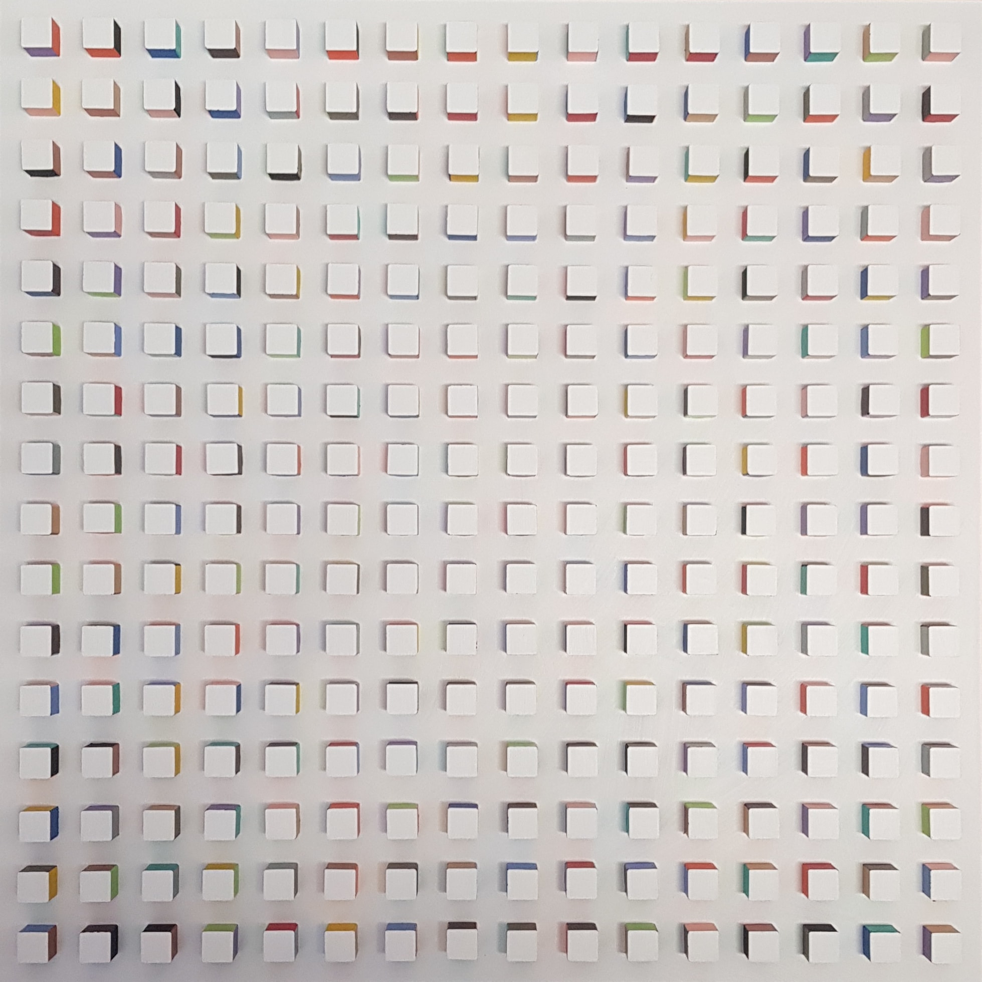 Tacconi realizza opere su legno e su carta, che indagano le forme basilari del cerchio e del cubo: se visti frontalmente i quadri appaiono uniformemente bianchi o neri, ma, spostandosi, è possibile percepire colori, sfumature, riflessi e giochi di luce, che tradiscono una complessità a prima vista non immediata. Tempo, luce e movimento sono quindi i fattori che necessariamente si combinano nella visione e fruizione di queste opere.