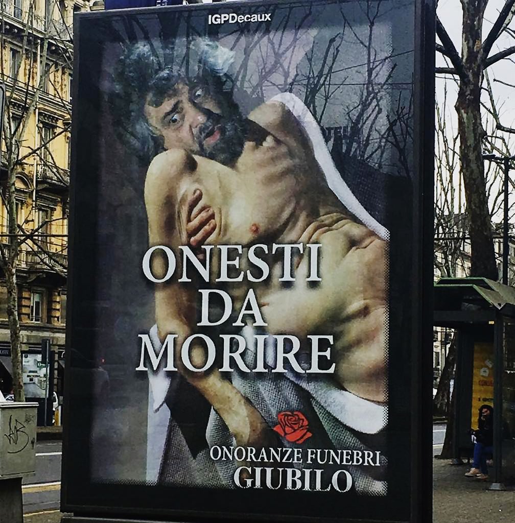 L’arte contemporanea è invece rappresentata dagli scatti di Salgado e Steve Mc Curry, utilizzati in manifesti a carattere xenofobo, passando dalla pietà iperrealista dello scultore Sam Jinks, o da “Toilet Paper” di Cattelan, nascosto sulla maglia indossata dalla nipote di Mussolini, che diventa così testimonial di contraccettivi. Ancora Cattelan viene omaggiato con la sua recentissima installazione “Eternity”, inaugurata quest’anno alla Accademia di Belle Arti di Carrara, reinterpretata con il titolo di una delle opere più celebrate di Joseph Beuys: “La rivoluzione siamo noi”, ultimo tra i manifesti comparsi ad annunciare il prossimo tesseramento del Partito Democratico.