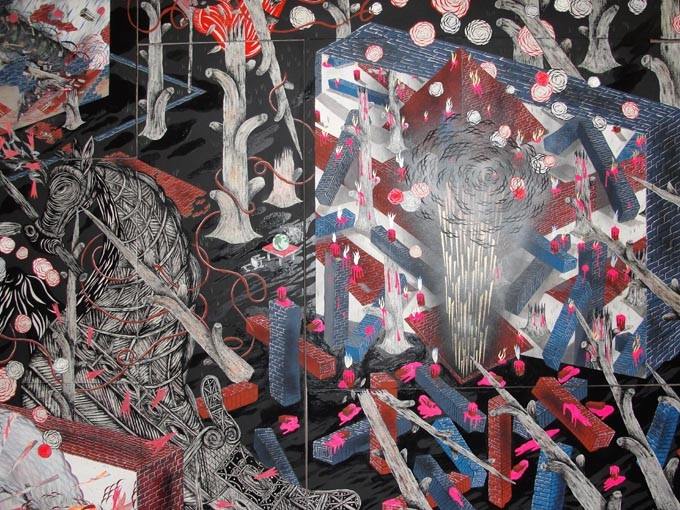 Andrew Schoultz – vive e lavora a San Francisco – è noto per i suoi iperdettagliati murali esterni e per i lavori su tela, tavola, carta, nonché per le grandi installazioni scultoree.