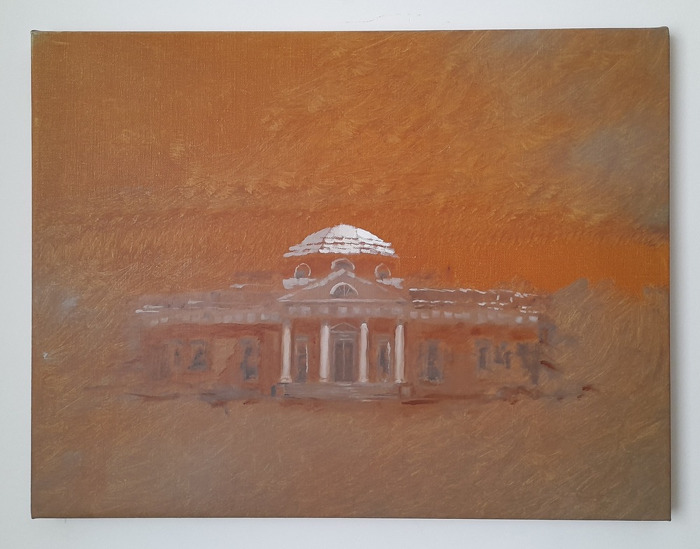 Le opere presenti in questa mostra sono il frutto di una collaborazione tra Andrew Smaldone e Stanza 251. Forti di una sicura confidenza con l'artista – derivante da una ormai lunga amicizia – lo abbiamo stimolato a realizzare una serie di quadri ispirati alla forma della villa neo palladiana americana. Da anni una grande parte del lavoro pittorico di Smaldone è concentrato sul ricreare spazi interni: camere, uffici, immaginari saloni, perfettamente vuoti, senza presenze viventi. Per questa specifica occasione l'artista ha prodotto una serie di opere che mostrano l'esterno degli edifici. Ecco allora apparire le facciate dei palazzi e delle ville. Un'apertura di prospettiva, con cupole, colonne, timpani. Elementi visti come in sogno, con bruciante consapevolezza. Ogni cosa è vista attraverso una filigrana vibrante, come se davanti ai nostri occhi fosse stato collocato un denso velario di energia, capace di sottili deformazioni percettive.