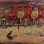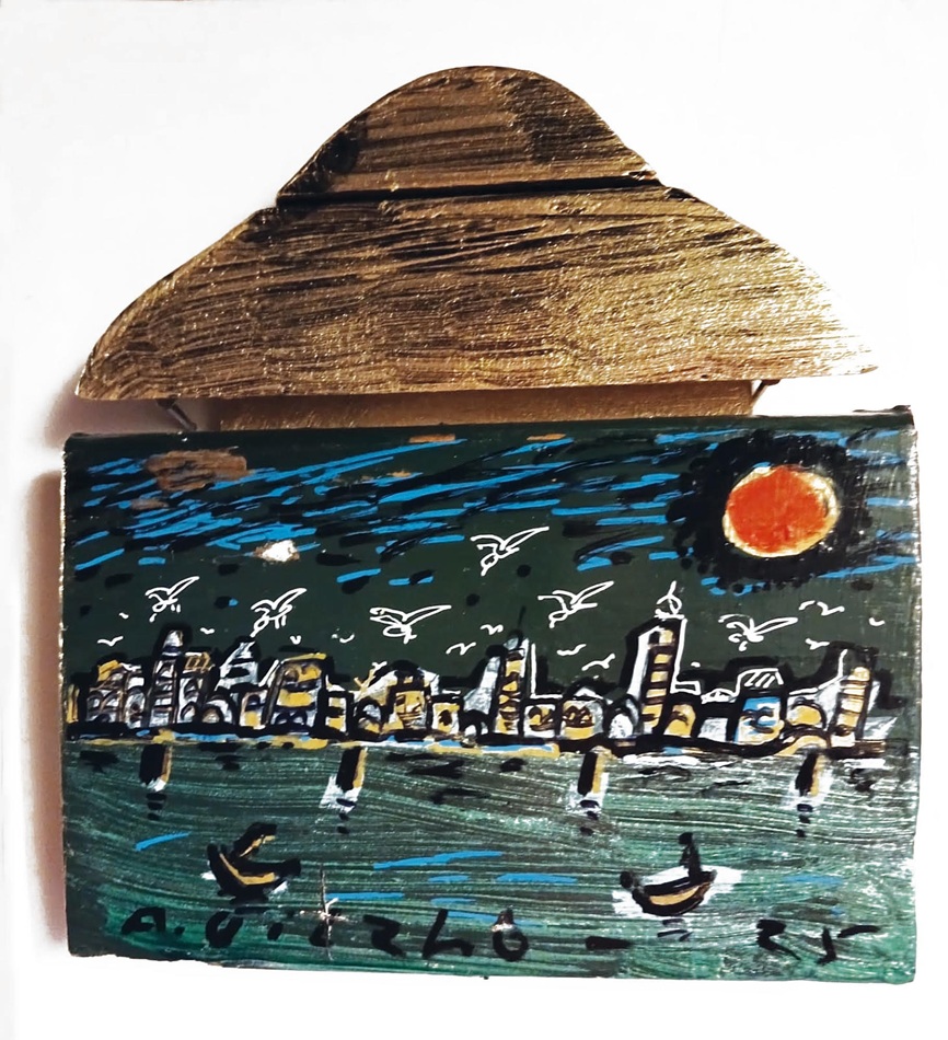 Saranno esposte 25 vedute di Venezia dipinte su vecchie ante di legno trovate in giro per la città che l’artista ha rielaborato conferendo loro una nuova vita. La città lagunare perde la sua classica immagine da cartolina e si trasforma in un mondo giocoso, popolato di gabbiani, palle di sole infuocate, navi tra i flutti di una laguna notturna. La sua Venezia si stende come una skyline lungo le assi allungate e strette. Il fondo oro del cielo è un rimando alla matrice bizantina della città così come di alcune delle tavole di Antonio Vivarini o dei trecenteschi veneziani.