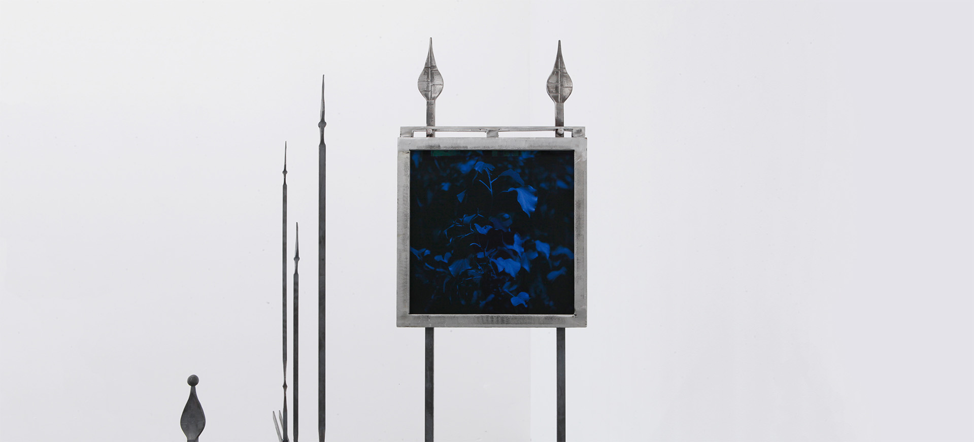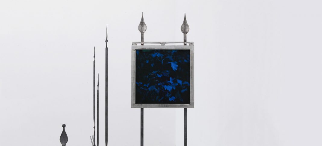 Le cancellate metalliche che suddividono lo spazio in molteplicità fanno da sostegni per fotografie in cornici di ferro, che ci ricordano giardini abbandonati, cimiteri e altri luoghi proibiti.