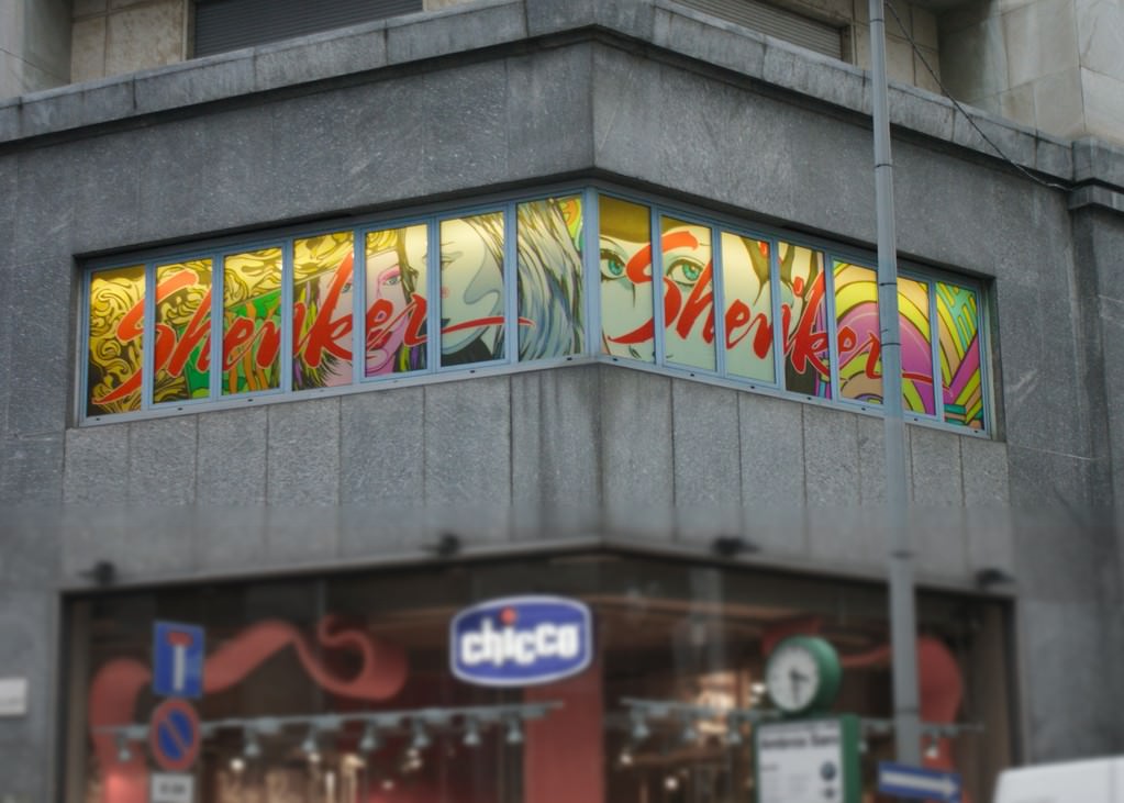 Installazione di pop art dell’artista Andy sulle vetrate di Shenker Culture Club in Corso Matteotti 10 a Milano, dal titolo “Blowing in the window – l’arte in vetrina”.