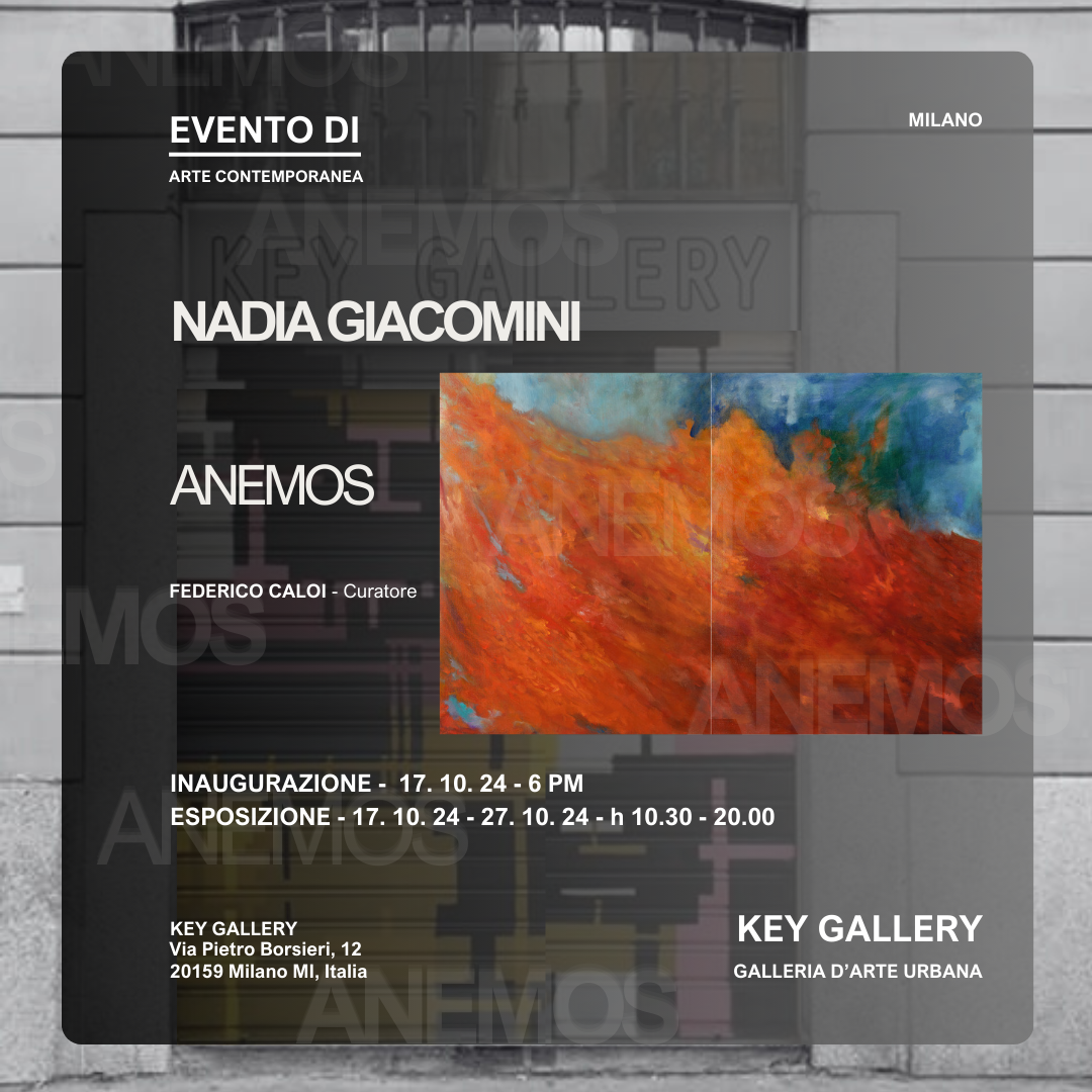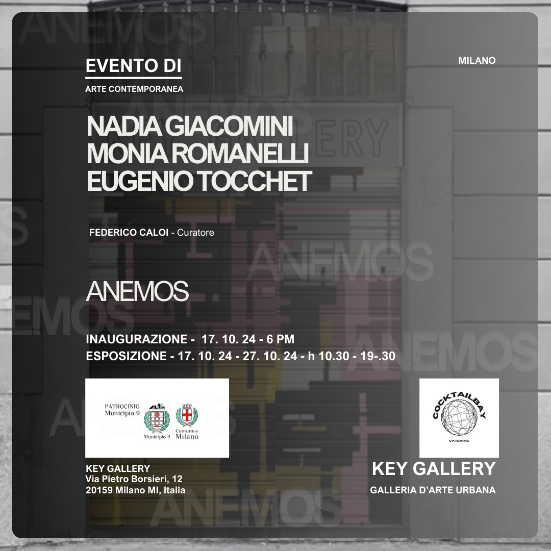 Milano, ottobre 2024 – Key Gallery e Federico Caloi sono lieti di presentare "ANEMOS", una mostra d'arte contemporanea che invita il pubblico a riflettere sui valori, per tornare a "vedere", per emozionarsi, per scoprire il legame che c'è tra estetica ed etica. Anemos è uno sguardo sulla sensibilità umana per tornare a vivere in un mondo che non è solo esteriore. Dal 17 al 27 ottobre 2024, gli spazi della galleria, in Via Pietro Borsieri, 12, si trasformeranno in un luogo di incontro tra arte e filosofia, dove le opere di Nadia Giacomini, Monia Romanelli ed Eugenio Tocchet daranno vita a un dialogo profondo e coinvolgente.