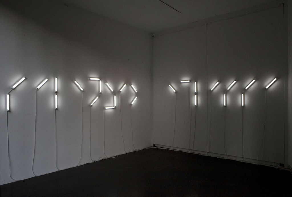 Così in Braille ligado, linee luminose collegano punti che compongono la scrittura di lettere proprie dell’alfabeto dei non vedenti. In galleria è rappresentato il titolo della mostra; le frasi sono dunque comprensibili solo dai conoscitori di questo linguaggio, e pur diventando luminose, perdono la caratteristica tattilità che contraddistingue la consueta rappresentazione del linguaggio Braille.