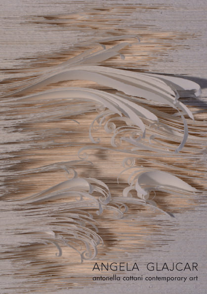 Angela Glajcar è una scultrice, lavora trasformando la cartaun in un materiale forte che impiega anche per lavori monumentali. Foglio dopo foglio, Glajcar costruisce le sue forme. E’ un incedere scolpito nello spazio attraverso volumi difformi.