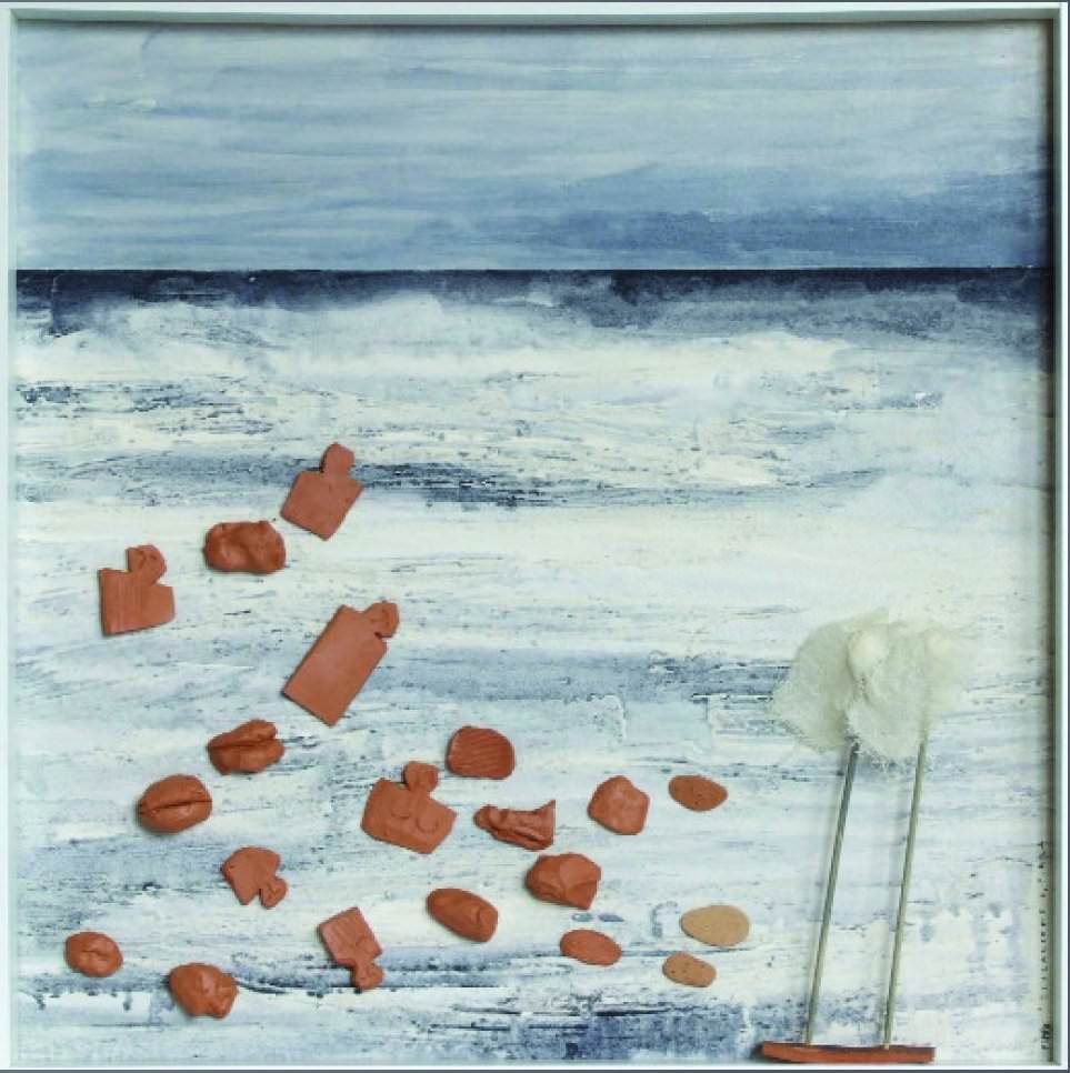 Anche in questi nuovi lavori che Angela Pampolini presenta qui alla Galleria del Carbone, i colori del Po sono gli stessi che lei utilizza. Nei primi quattro: Prima del mare e della terra e del cielo..., Terra, Mare, Cielo, i colori, le terre, i blu profondi, i marron e i ruggine sono gli stessi. Caduta di Fetonte, una tecnica mista su carta ricoperta di tela con stoffe, acquerello, matite, terracotta con dorature, cera e fil di ferro, pare essere una summa del percorso del nostro grande fiume. Usa gli stessi colori e gli stessi materiali, identifica questo fiume e il suo cielo per raccontare storie antichissime di mitologia.