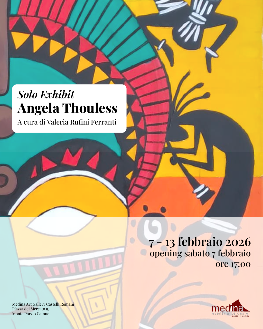 Prosegue il percorso espositivo di Angela Thouless, artista scozzese che completa il tour italiano nella gallery dei Castelli Romani dopo la prima tappa da Medina Art Gallery Roma. Un coloratissimo mondo fatto di totem tribali e maschere variopinte vi aspetta dal 7 al 13 febbraio 2026. Non mancate!