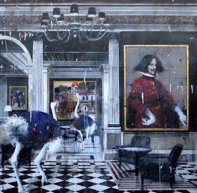 Un mondo in cui la solitudine e il freddo dello spirito convergono a minare le basi della solidità sociale, della spontaneità e della gratuità della relazione, del bello dello stare insieme, un mondo liquido, spento, un posto dove la luce filtra e che Accardi trasforma nell’angoscia, meglio, nell’attesa di un qualcosa di imminente che poi accade. Cosa accade? Uno struzzo non è una figura ingenua e non è un animale e basta, ma la sconvolgente verità della deriva, della frammentazione e dell’assenza. Una mancanza, potrebbe essere l’elemento di disturbo in una società addormentata, anestetizzata, alla deriva concettuale e spirituale. Accardi, gioca, lo fa con serietà, lo fa sapientemente e giocando mette in luce, coi cromatismi, coi simboli, coi riferimenti storici, con la faccia familiare di Homer Simpson e con la brillante trovata dell’arte che guarda se stessa, che si giudica oggi di fronte alla storia e a un presente non più attuale perché attualità è vita di significato. Questa stessa vita, questa realtà Accardi la pone cruda come l’odore della pioggia prima che il cielo rovesci. Si percepisce nell’aria un profumo nuovo, nelle opere questo profumo di pioggia imminente cavalca i simboli dell’arte entrando come attesa di qualcosa nell’animo umano.