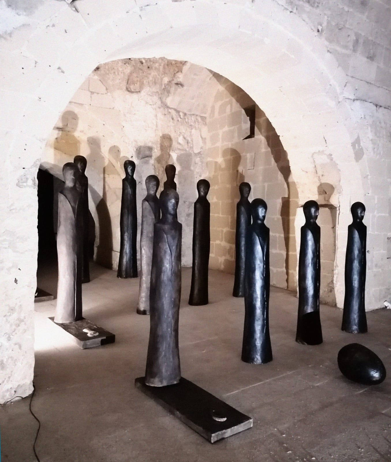 Nell’analizzare l’installazione, Identità?, la più imponente della mostra, Andrea Romoli Barberini, curatore della mostra, osserva: “[…] Sono umani simulacri, figure ieratiche, stanti, ma la loro arcaica fissità e la sommaria e reiterata caratterizzazione fa pensare, anche, a epoche distanti, iconiche rappresentazioni di lontane esistenze, di eroi e semidei, consumate in remote culture. Riduttivo considerarle il frutto di una ricerca plastica che ha trovato l’ennesimo punto di tangenza tra una certa idea di scultura e le seduzioni degli arcaismi mediterranei di pregreche civiltà. […] Sono l’effetto dell’annichilimento, di certezze smentite, quesiti irrisolti, dubbi indissolubili, angosce riemerse dalle più intime e comuni profondità; e la fissità delle posture non basta a dissimulare dietro l’apparente, rassegnata impotenza, la forzata e sofferta compostezza che tutte le caratterizza. […] Anche in quest’opera, tuttavia, Aligia, con un semplice ma efficace gioco di luci aggiunge una ulteriore e insospettabile possibilità di lettura, quasi una speranza celata nel buio. E’ nelle ombre di queste figure, infatti, che sembra di ritrovare quella vitalità negata nella fisica tridimensionalità di quegli stessi simulacri. Un’energia che può trasformare un mesto rito della memoria intriso di malinconica nostalgia in concreta riflessione su valori antichi ed eterni, pensiero funzionale all’azione, tensione al futuro.”
