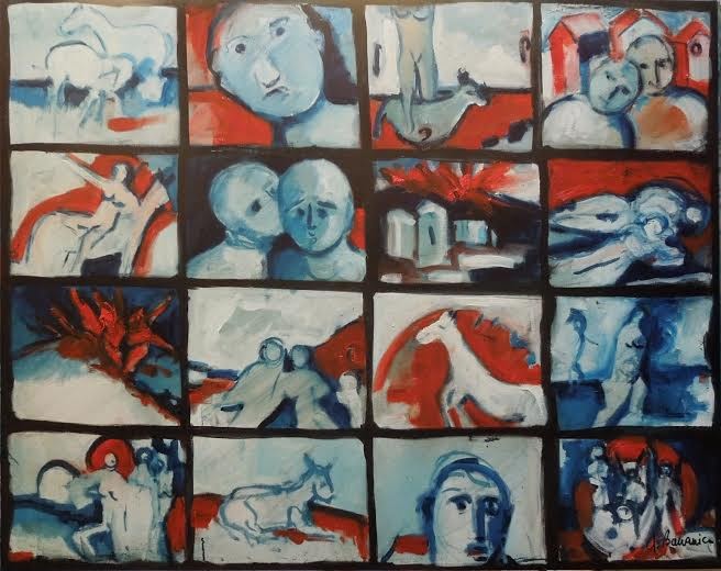Angelo Baccanico è diretto, senza mediazioni. Nella sua pittura si rincorrono ombre in fuga, quasi smaterializzazioni di silhouettes, accennate con tagli rapidi di occhi e di sguardi in un paesaggio, per metà mitico e per metà gioiosamente epico, su cui vola una mano divina a difendere il terreno, il territorio, il bene comune e una sorgente di fuoco attende lontano il suo momento per poter far sentire la sua voce confusa tra vomitanti ruggiti e bagliori accecanti, se mai dovesse un giorno risvegliarsi il vulcano. Il Vesuvio, che si staglia tra griglie blu, per il momento, raccoglie il respiro di febbricitanti ritmi e di tacite frenesie. Angelo Baccanico imposta la redazione delle sue opere con variegati impasti cromatici, talvolta accesi. Il “focus” dell’azione pittorica di Angelo Baccanico cerca di estroflettere immagini forti; sono emblematici i dipinti “Riquadri Vesuviani” e “Vesuvio in gabbia” in cui viene esaltata la rete blu sulla montagna blu, da cui fuoriescono frammentate cromie rosse. Le ombre che sottili animano il campo visivo e i fuochi che occupano spinti chiasmi risultano, essenzialmente, macchie guizzanti e respiri palpitanti, tra incroci simbolisti, contaminazioni immaginative, ibridazioni vincolanti. Insomma, nella pittura di Angelo Baccanico si rincorrono motivi certi di un’inquietudine. Il forte talento intellettuale di protagonisti della vita culturale italiana porta sempre verità chiare e trasparenti e la pittura di Angelo Baccanico è diretta; talvolta, appare multifocale, poiché si vedono, in differenziati piani-sequenza, frames consecutivi di teorie descrittive parallele. Angelo Baccanico assicura soggetti che hanno voglia di conquistare lo spazio, anzi tentano di sedurlo, di coprirlo, di invaderlo e questa costante si ritrova nella dinamica, dichiarata ed estrema, di incursioni figurative, ma anche gli approcci, sempre paralleli, di carattere e tono informale testimoniano, in contrasto, penetranti ed effusive micro/macro-tessiture. Angelo Baccanico imposta la redazione delle sue opere con variegati impasti cromatici, talvolta accesi, anche per favorire l’assunzione icastica della scena e controbilanciare la segnica presenza dei protagonisti che l’animano. Il nostro vivere, con tutte le problematiche quotidiane e le opacità di bilancio, può essere controllato ed esaminato grazie ad una profonda presa di coscienza, corroborata anche dal vaglio di ciò che si sedimenta o che s’intende sedimentare. L’artista assegna a una personalissima scala di colori, regolata da reticoli di segmenti, che vibrano tra torsioni dinamiche, pensieri alti e ci riassumono l’uomo che riattraversando i miti oltrepassa la storia. Il suo itinerario pittorico, sostanziato da suggestioni e visioni simboliste, nelle quali si percepiscono accadimenti possibili o prossimi futuri tracciati da figure semioniriche, da ombre danzanti e da presenze variegate, raccoglie e assembla, seguendo palpitanti visioni, un esercizio cadenzato di tocchi e di determinazioni di sostegno; così, l’artista con redazioni pittoriche caricate assume una posizione propria, agganciata, comunque, a solchi di ambiti simbolici. La pittura di Angelo Baccanico snoda sequenze e inquadrature di un universo raccolto da risposte di uno specchio intimo, che guarda anche al mondo, alla nostra terra toccata dalla mani dell’uomo, al nostro territorio sfregiato, al nostro orizzonte. Le fratte stesure, premiate da rossi infuocati, da bianchi lancinanti o da blu notte, aprono nuove frontiere di un percorso sensibile. Angelo Baccanico cura l’assoluto divenire con coniugazioni cromatiche acconce e sagoma e rifila campi leggendari dell’origine per meglio intendere i profili del futuro. Oggi, studia il malessere con le depressioni dell’esistenza per meglio comprendere virtuali cunei di speranze future.