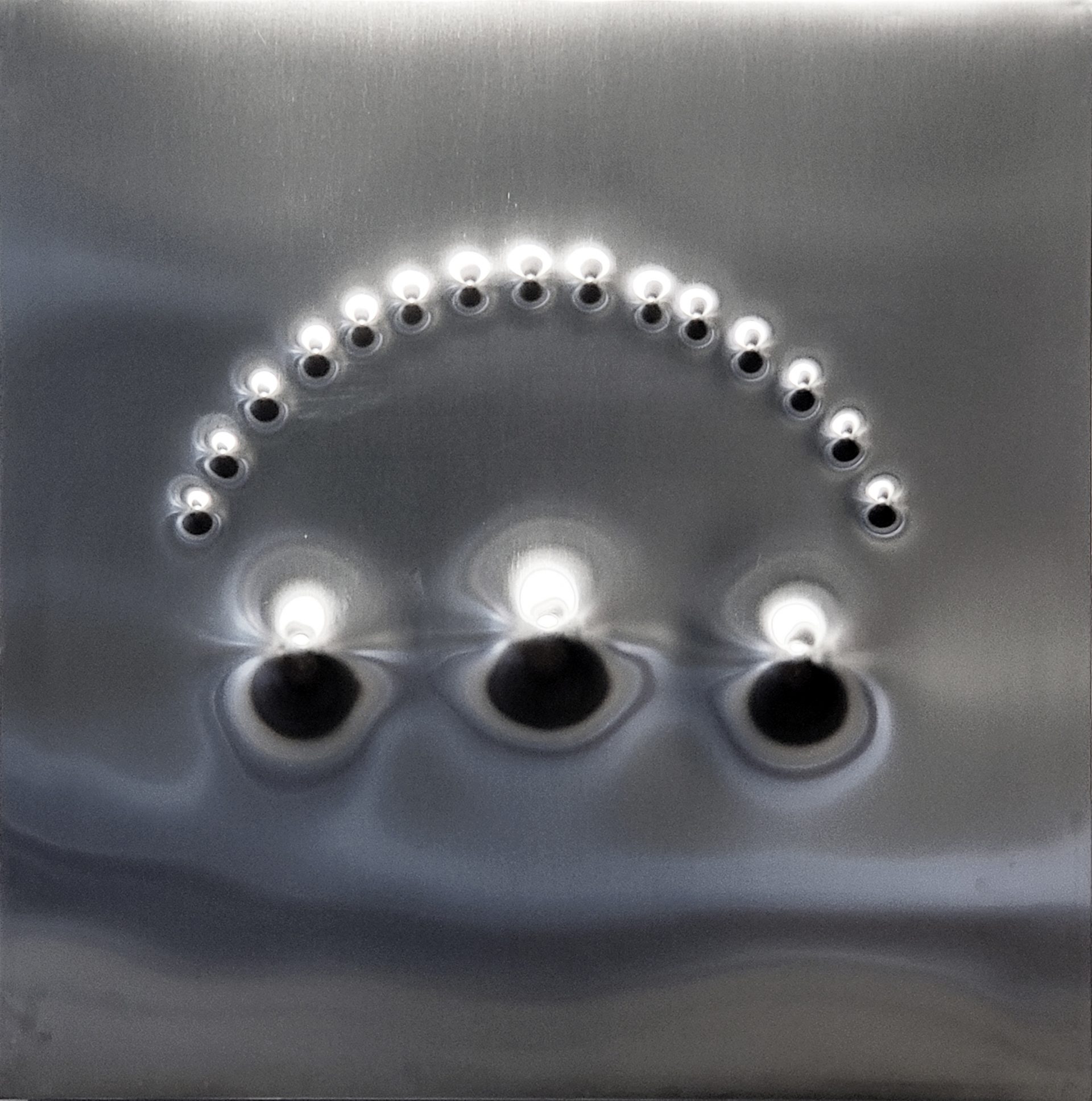 L’artista, ossessionato dalla velocità e soprattutto dalla luce, si propone di definire in modo personale la nozione di spazio e tempo usando le armi invece dei pennelli. Vuole interpretare la velocità del pensiero e tramite questi strumenti atipici spara su supporti, ora in acciaio ora in alluminio. Le pallottole, in questo modo, modificano le lastre con protuberanze che danno all’osservatore il senso della vibrazione. Sta qui l’originalità di Brescianini.