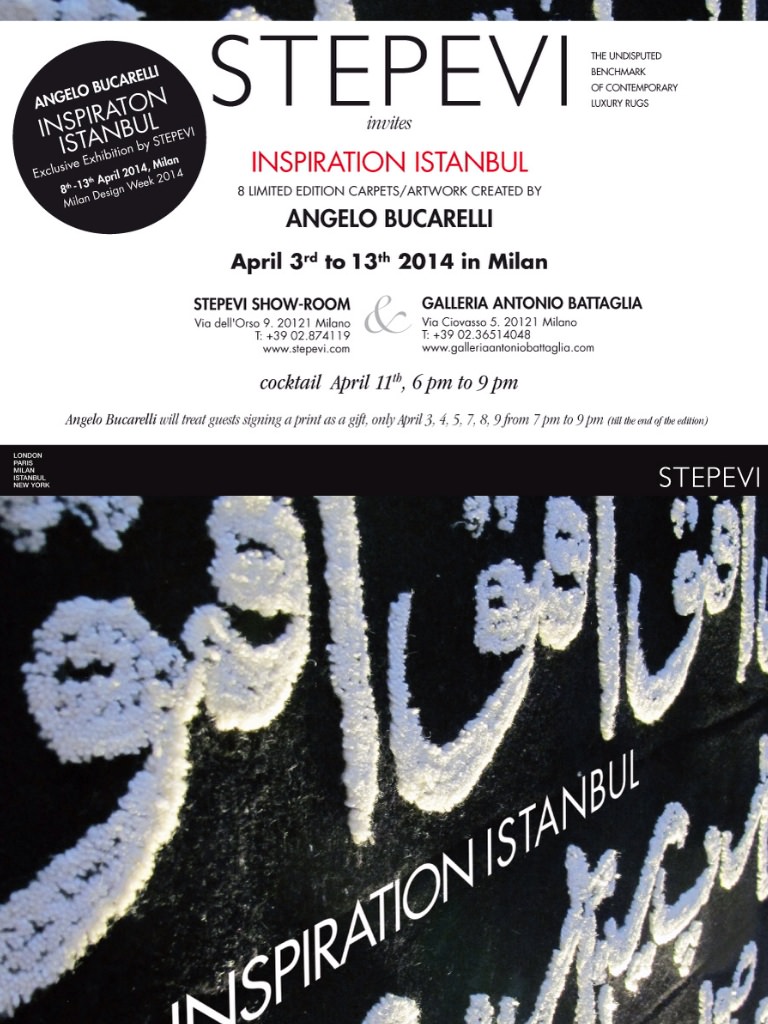 Dal 3 al 13 aprile 2014 STEPEVI, l’indiscusso riferimento nel mondo dei tappeti contemporanei di lusso, che vanta diverse boutique in tutte le principali capitali del mondo, presenta nel proprio show-room Milanese e presso la Galleria Antonio Battaglia, una speciale edizione limitata di 8 tappeti creati dall’artista Angelo Bucarelli per la mostra "Acqua. Come lacrime d'Amore", realizzata per l'Istituto Italiano di Cultura di Istanbul, evento parallelo della 13a Biennale di arte contemporanea di Istanbul.