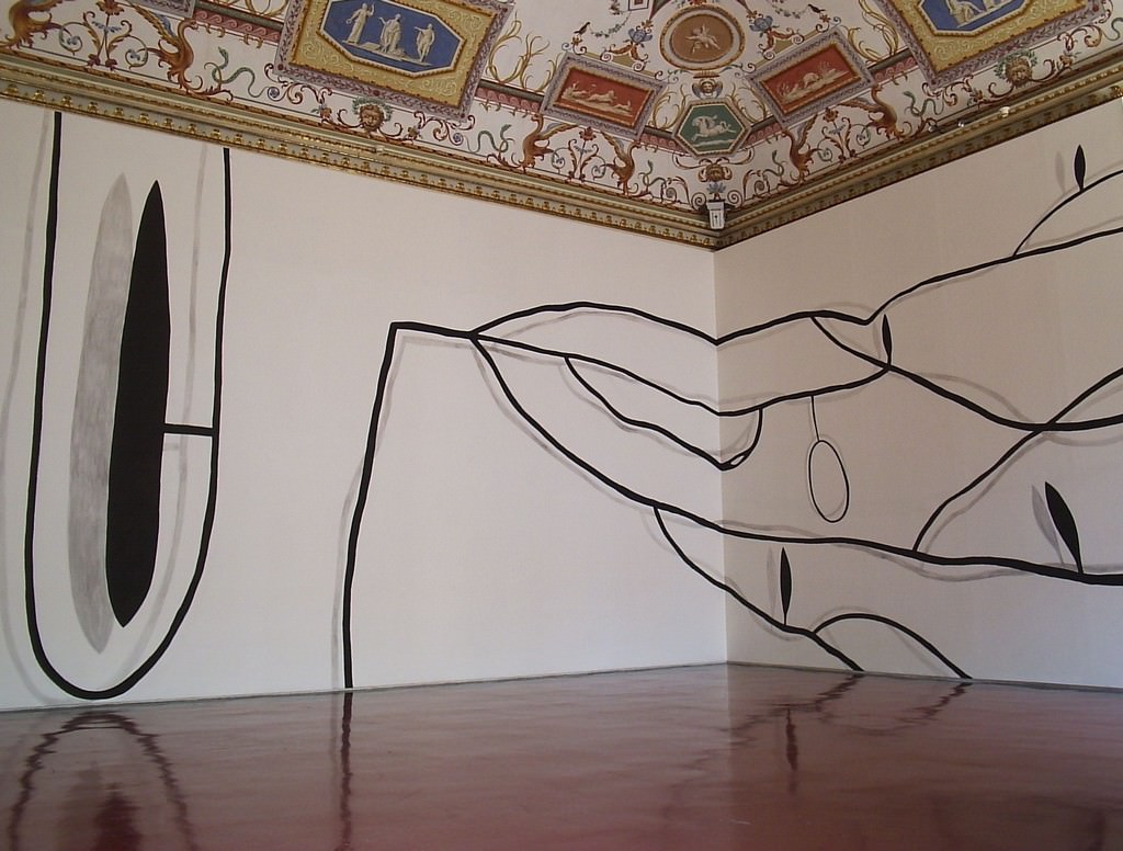 “Angelo - osserva Massimo Bignardi nel saggio al catalogo - ha lavorato nelle sale della Reggia, anche nelle tarde ore del pomeriggio, quando le architetture, le cose e gli oggetti allungano la loro sagoma di ombra sulla terra e il giorno si fa preannuncio alla sera; ha disegnato e dipinto solo con il nero, con le ombre che esso lascia come 'bave', tracce che raccontano di una sofferta attesa, di qualcosa che, per giorni, ha velato di ansia e trepidazione la sua capacità d'impaginare il futuro. Ha saputo narrare la sua fragile condizione di fronte alla paura che è propria di chi attende con il fiato sospeso; l'ha saputa elevare, con leggerezza a condizione dello spirito, rinunziando alla gravità terrena del dolore. Questa grande pittura, questo specchio lucido nel quale è possibile scoprire ogni attimo del suo evolversi come racconto è posta in dialogo con tre piccole sculture che Casciello ha voluto inserire nel breve tracciato che raccorda tra loro le tre sale: sono corpi che scandiscono lo spazio posti come figure che interloquiscono con la superficie, oggettualizzando i segni, imprimendo ad essi la cifra di evidenze immaginative”.