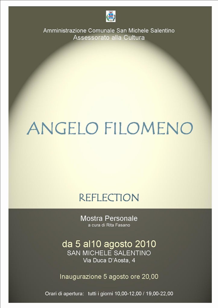 L’esposizione, dal titolo “Reflection”, è organizzata dall’Amministrazione comunale, assessorato alla Cultura e curata dalla responsabile della Pinacoteca Comunale, prof.ssa Rita Fasano.