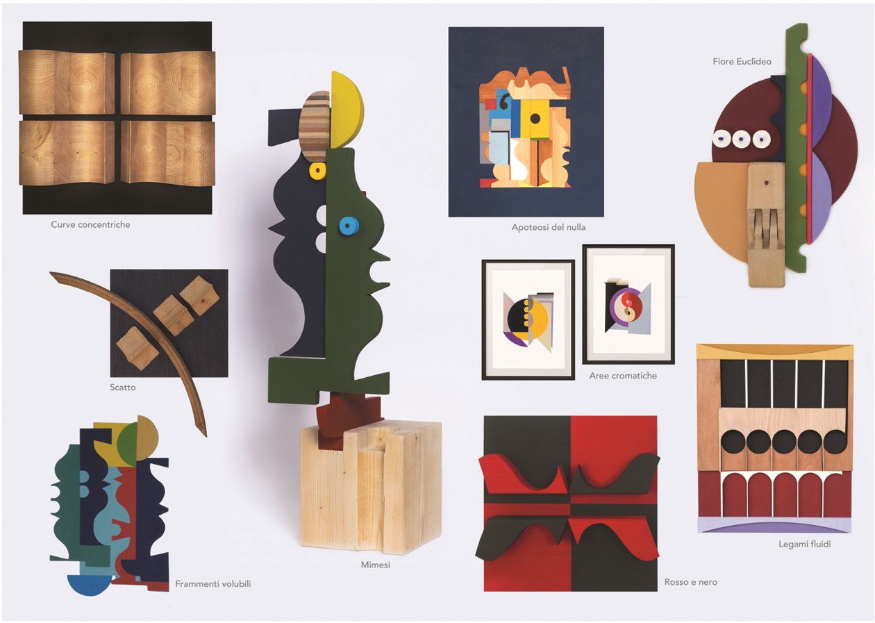 L’artista vive il legno sempre in medias res, quasi fosse senza principio e senza fine, entro figure paniche, tutte emotive. Ogni momento è ritmico e secondo, lunare e plurimo, riflesso che segue e ripete un’origine in declinata invocazione. Tuttavia, il cromatismo e lo stato ritmico della ripetizione in figura d’incastri di poli oppositivi elementari gettano il luogo fratto e inerziale del legno nell’ardenza ignea del movimento dialettico, ove il cerchio si eleva a simbolo della danza armonica in chiasmo fra le forme dell’arte e finanche fra opera e fruitore. Nel movimento ad intreccio è l’atto di transustanziazione, di un’identità nutrita dalla differenza.