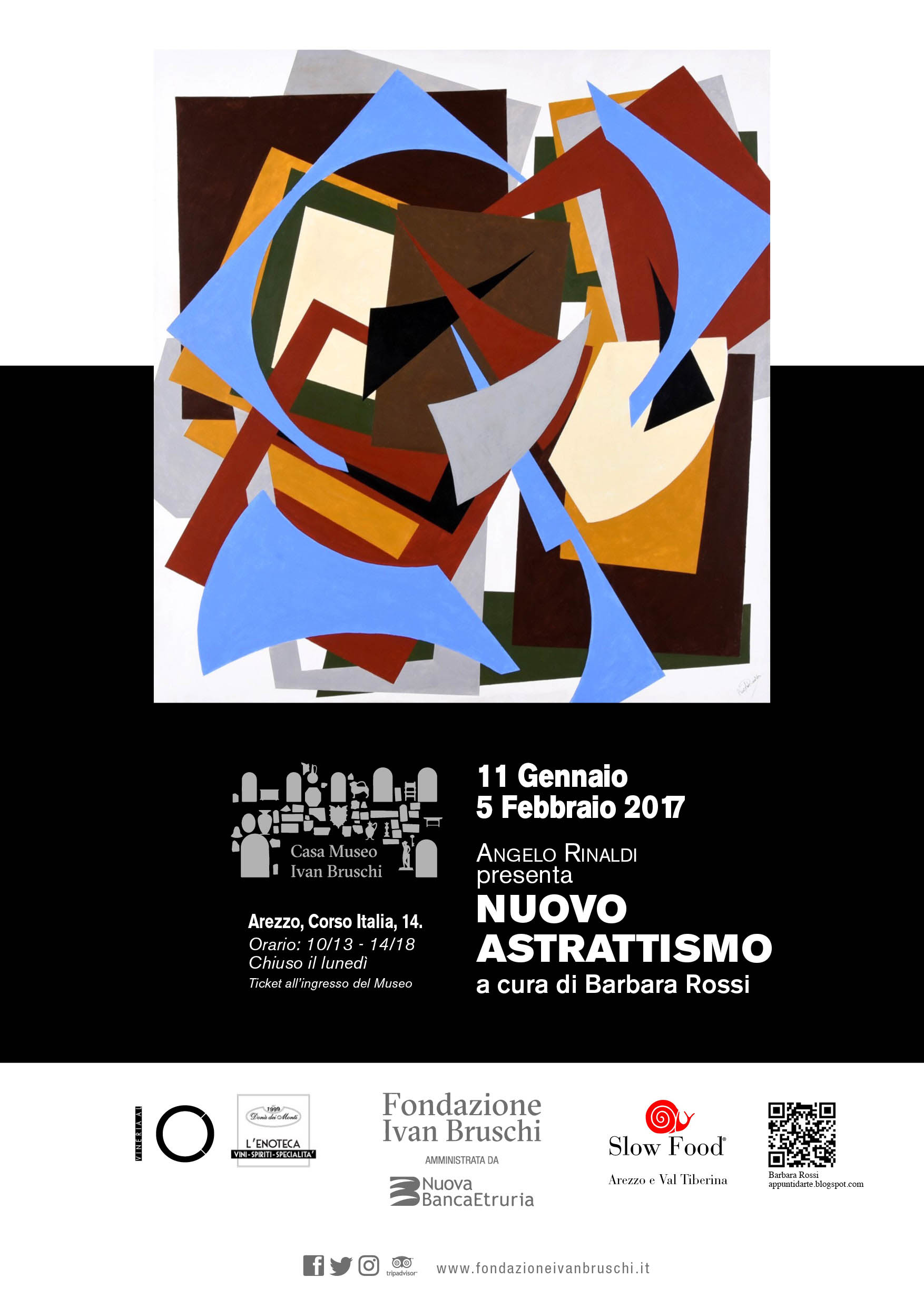 Angelo Rinaldi “ Nuovo Astrattismo “ personale dell’Artista negli Spazi del Museo “ Casa Museo Ivan Bruschi” di Arezzo.L’Evento permette di vedere un’ importante numero di opere del Maestro che, sono state già esposte , negli ultimi anni, in eventi nazionali ed internazionali, su iniziativa del Ministero degli Esteri, La Fondazione Sartirana Arte di Sartirana (Pavia), La regione Lombardia, la Provincia di Pavia, la regione Veneto, in collaborazione con le Ambasciate e gli Istituti Italiani di Cultura nei rispettivi paesi ospitanti.Ricordiamo che alcune delle opere dell’artista sono visibili, accanto ai maggiori Artisti Italiani, negli spazi del Palazzo della Farnesina, a Roma, che è la sede del Ministero degli Esteri Italiano.Allestita il giorno 10 Gennaio per i collezionisti, a Fine Mese presentata a Grandi collezionisti per terminare il 15 Febbraio.Ogni informazione rivolgersi al Museo “ Casa Museo Ivan Bruschi di Arezzo “,e al curatore Barbara Rossi.