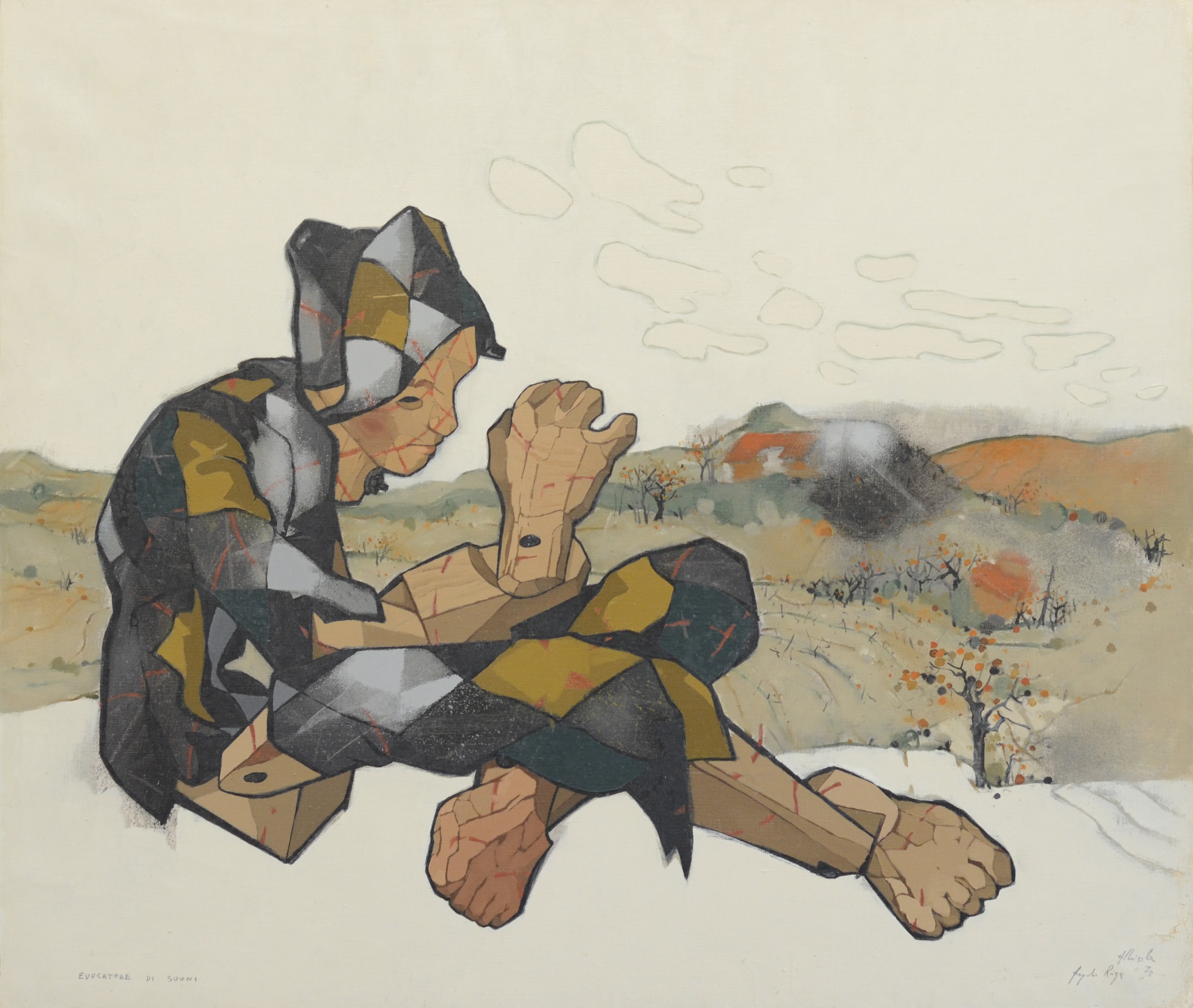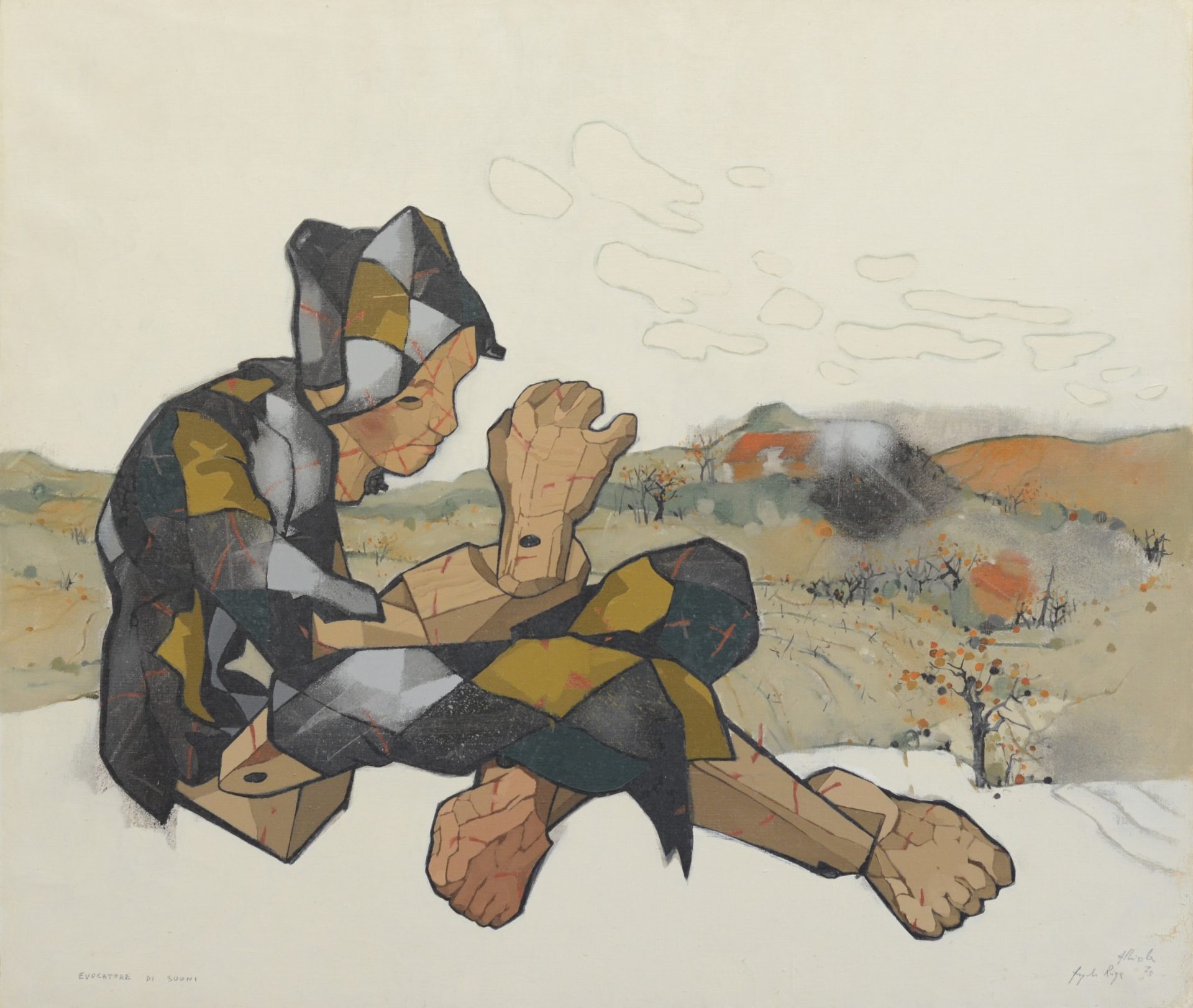 «Non temere/non vogliono te/li hanno messi lì/a far paura/ma non hanno occhi/solo fessure/e le loro braccia/son rami/le mani due cenci/e i fucili/due bastoni/che a primavera/fioriranno». Così, in una poesia del 1993, Angelo Ruga (1930-1999) sembra trovare una via d’uscita alle sue sofferenze: lo sguardo sulle colline è ormai privo di tensioni. Questi versi fanno riferimento ai corpi in legno degli Spaventapasseri, opere che rappresentano uno dei punti più alti dell’arte di Ruga: “Grandi sculture polimateriche, realizzate a partire dal 1973 con materiali poveri e di recupero […] nascono ed esistono nella loro relazione con l’ambiente naturale” (Bochicchio, 2021). Come maschere della tragedia greca, gli spaventapasseri sembrano recitare una drammaturgia di volti e gesti muti nelle campagne di Mongreno. Sono simulacri attraverso i quali l’artista crea il proprio alter ego, restituendo alla collina l’anima di quegli spiriti apotropaici incontrati tra i campi.