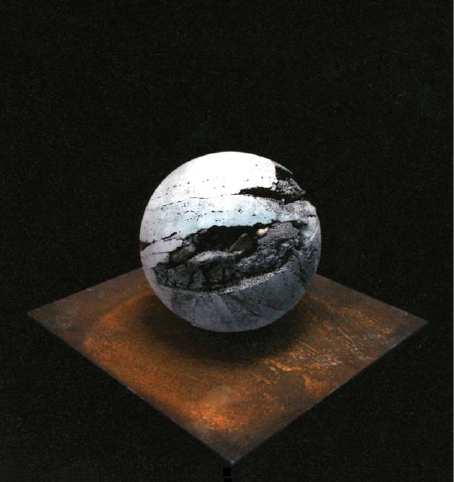 La sfera, simbolo di una sintesi perfetta tra tensione ed equilibrio, ferita e sutura, contatto e dialogo di materie diverse, ha assunto in sé questo compito di rivisitazione e superamento della distruzione per esprimere una bellezza rinnovata e pura. Posta al suolo la sfera determina un’azione dello sguardo e una circolazione nello spazio. Orienta l’andamento di ciascuno nel luogo espositivo.