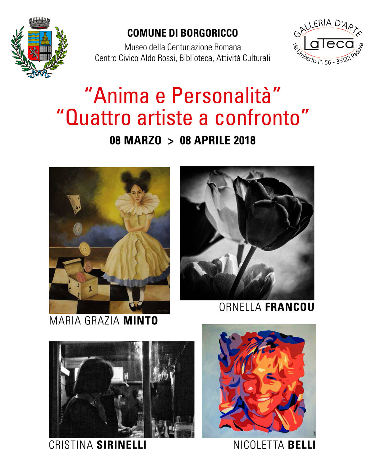 Il Museo della Centuriazione Romana del Comune di Borgoricco, importante sito museale che raccoglie i reperti archeologici recuperati nel territorio del Graticolato Romano, ovvero l’organizzazione agraria messa in atto dai romani nel I° Sec. a. C. in ambito padovano, e risalenti alla Preistoria, al periodo romano e all'età medievale e rinascimentale, accoglie nello spazio espositivo del secondo piano e nell’attigua loggia del Teatro Aldo Rossi, la mostra collettiva “Anima e Personalità – Quattro artiste a confronto”.
