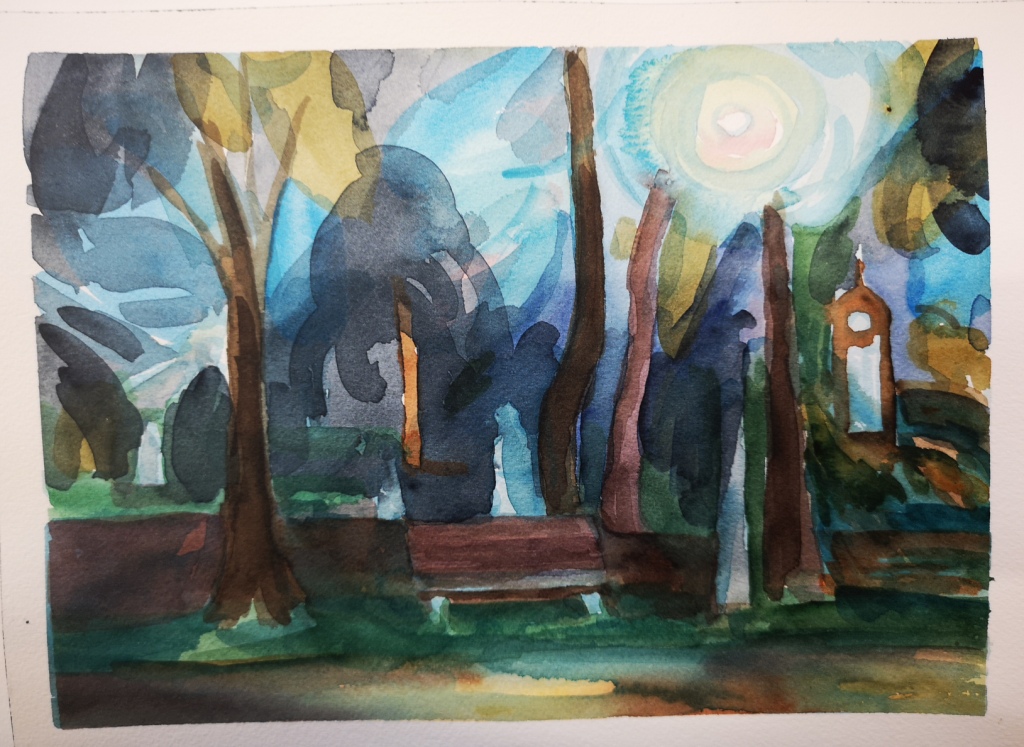 “I pini giganti, un sorprendente spazio tra i grandi alberi, la luce era divinamente bella, e con una forza di colore che quasi accecava. Qui c’era la pace paradisiaca, tranquillità e bellezza. Non c’erano molte persone in quella serata di tutti i giorni, ma molti uccelli, suoni e profumi. Nel crepuscolo, i memoriali di diversi personaggi storici brillavano e davano vita e tempo al parco da riempire (…)
