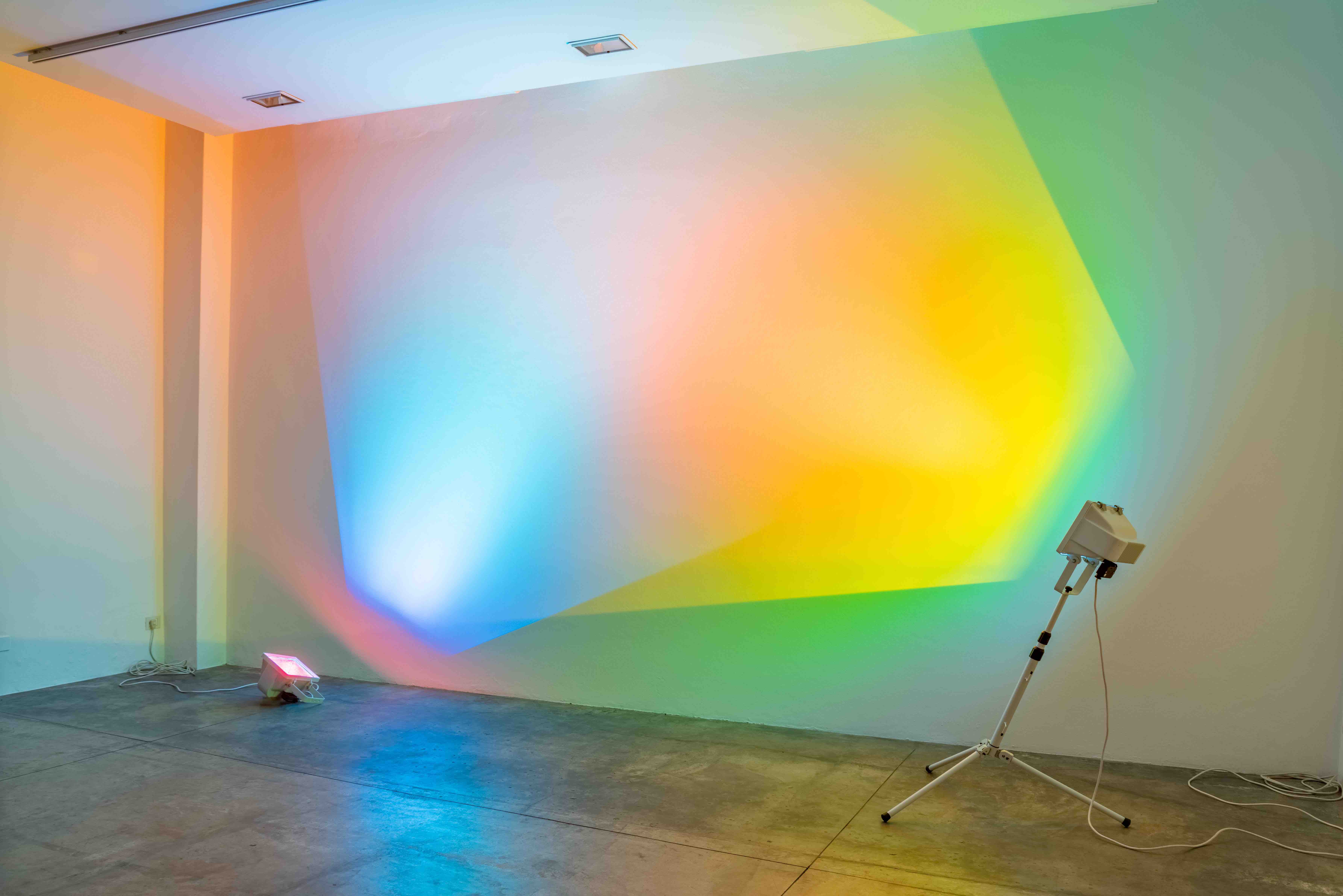 La sua scultura può essere intesa anche come un gesto molto semplice, che cambia ogni volta in relazione allo spazio e ai corpi che l’attraversano e la vivono. Era semplice e infinito il gesto che aveva determinato l’opera alla Punta della Dogana di Venezia – quella manciata di glitter luminescente gettato a terra – ed è ancora semplice e potente l’installazione pensata oggi per la mostra alla Galleria G7. Nel piccolo ma articolato spazio della storica galleria, la luce, materia principale di molti suoi lavori, è l’unica protagonista. Si tratta di due proiezioni colorate, corpi di luce senza corpo, indeterminati e definiti allo stesso tempo, che sembrano oscillare, muoversi sulla superficie della parete, secondo il movimento delle persone nello spazio.