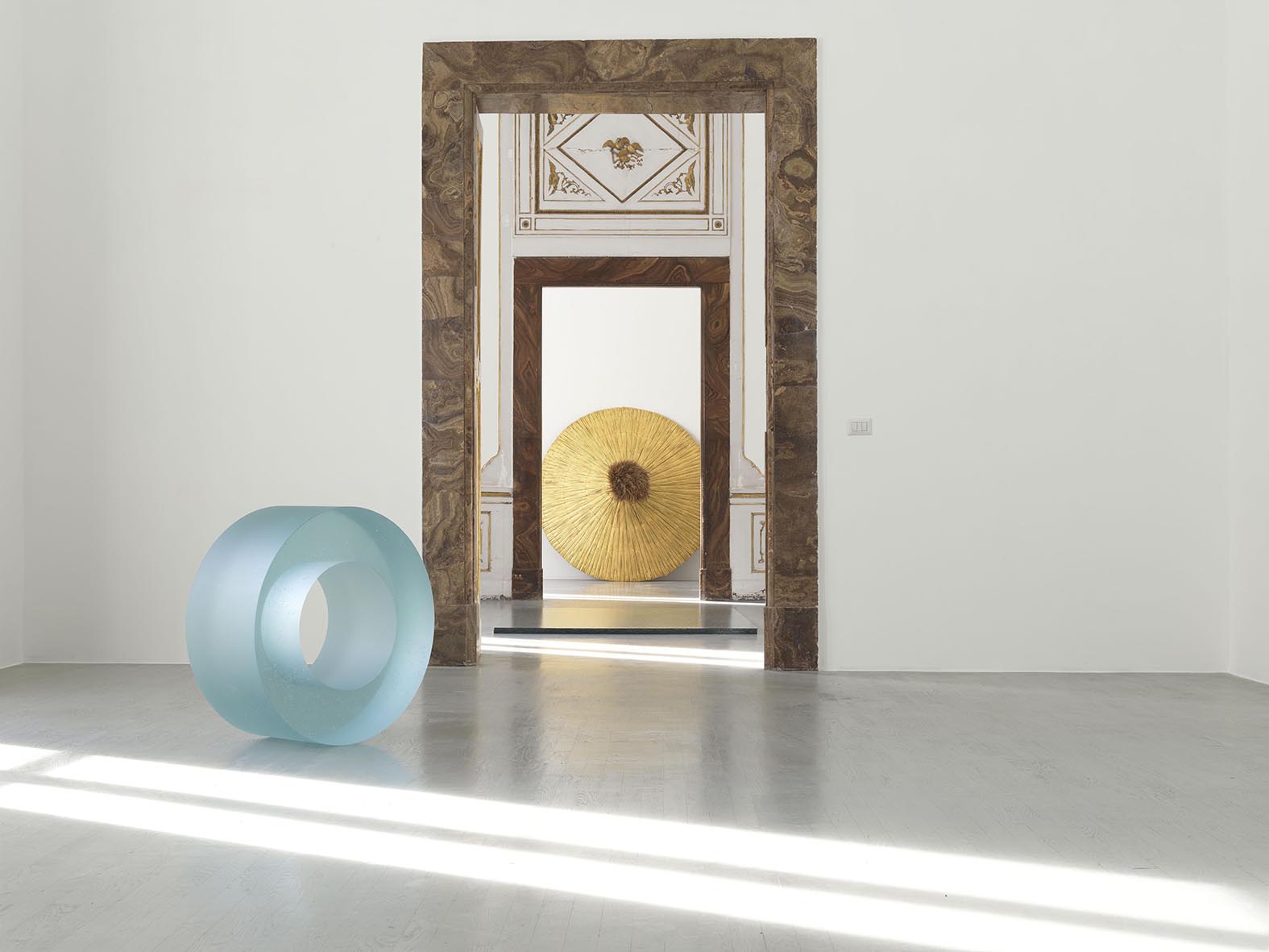 In another room a glass ring, Blue Glass Roll 405/2, 2019 evokes movement and time. Small nebulae of air bubbles can be seen in the material, trying to escape during the long cooling process in an expanding effort. In this piece Ann Veronica exploited the point at which glass appears to be blue rather than transparent.