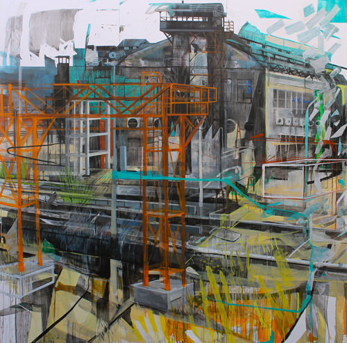 Quest’anno, sarà la volta della giovane artista Anna Capolupo (Lamezia Terme, 1983, vive e lavora a Firenze), che entra a far parte della collezione di BCC Mediocrati con l’opera Santa Eufemia (nervi). Capolupo, già protagonista dell’edizione 2013 del progetto espositivo itinerante Young at Art del MACA (Museo Arte Contemporanea Acri) e finalista quest’anno sia al Combat Prize che al Premio Terna, è la prima artista Under 35, nonché la prima donna, a partecipare al Progetto Bancartis, e lo fa presentando un dipinto di grandi dimensioni, in cui uno scorcio del passato industriale dell’area di Sant’Eufemia, nella città natale dell’artista, rivive attraverso una tecnica articolata e ruvida, enormemente evocativa e dal forte impatto visivo. Colori acrilici, tempere, gessi e carboncini si sovrappongono donando vita a strati di materiali diversi – cemento, ferro, terra –, che acquisiscono una sensazione di realtà tattile, resa ancor più viva dall’utilizzo del supporto di strati di carta grezza applicati sulla tela, a loro volta strappati e reinseriti nel dipinto in un patchwork che fonde insieme astrazione espressionista e figurazione architettonica.