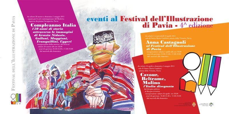 Tre sono le mostre in calendario dal 26 marzo al 1 maggio, diversi sono i modi in cui questa quarta edizione del Festival festeggia i 150 anni dell’Unità d’Italia e affronta l’appassionante racconto del Risorgimento italiano. Si parte con la prima mostra, quella principale, in gran parte costituita da disegni di Grazia Nidasio, affiancata da nomi importanti per l’illustrazione italiana come Adelchi Galloni, Federico Maggioni, Michele Tranquillini e Mario Uggeri. Dal 26 marzo al 1 maggio, Spazio per le Arti Contemporanee del Broletto, Pavia. La seconda mostra è la personale di Anna Castagnoli, giovane illustratrice italiana, a cui gli organizzatori del Festival hanno deciso di conferire in occasione di questa edizione, il premio “ILL 2011”. Dal 2 al 13 aprile, sala di Santa Maria Gualtieri, piazza della Vittoria. Infine, la mostra sull’ “Italia disegnata”, in cui, sempre seguendo il filo conduttore del Risorgimento italiano, si alternano tavole di Beltrame e Molino, "storici" illustratori delle copertine della Domenica del Corriere. Dal 16 aprile al 1 maggio, sala di Santa Maria Gualtieri, piazza della Vittoria.