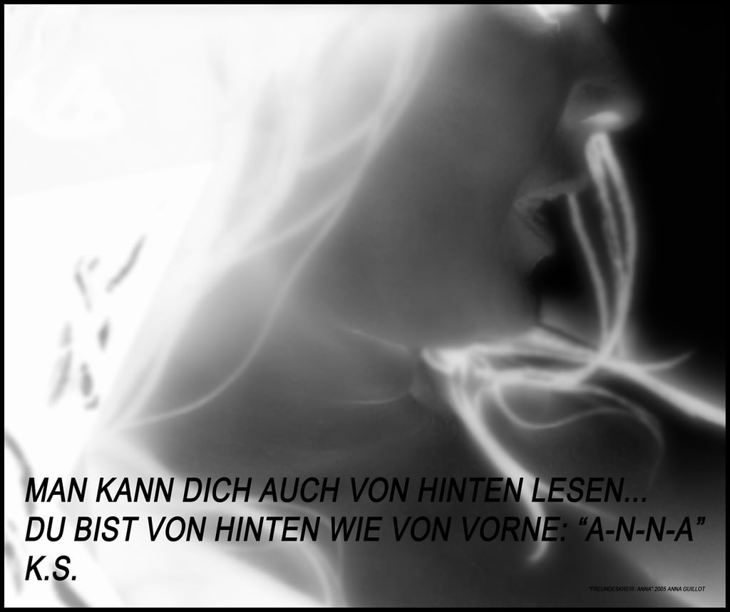 Ed Eugenio Miccini: «(…) allora il suo amore sempre differito non si aggira su di sé, come Narciso – che è personaggio tragico – ma come coscienza del proprio essere e del proprio operare, che è, ancora cartesianamente, il fondamento di ogni processo di ricerca. Anna, dicevo, si ama in maniera imperfetta perché c’è in lei qualcosa di incompiuto, di incerto come avviene in chi si metta alla prova, che si esperisce con fiducia in sé e nella propria “ascesi”. Sirio Luginbϋhl lo definisce «un orgasmo tra Anna e Anna». Si dice che la madre di Narciso interrogasse l’indovino Tiresia, e ne ricevesse questo oscuro oracolo, che cioè sarebbe vissuto finché non si fosse conosciuto. Ovviamente Anna, che non ha subito la vendetta della Nemesi, proprio perché quell’orgasmo è imperfetto, ha una libido inespressa e qui consegnata alla durata del tempo di una lunga investigazione. Come chi si guardi agire, come chi parli di sé in terza persona. Diceva Paul Valery «avere coscienza di sé non è forse percepire che si potrebbe essere un altro? (…) la parte più vera e più identica di ogni individuo è il suo possibile». (cfr.: M. De Benedictis, in “Il doppio e la rappresentazione”, in Avanguardia, 17, 2001). Non a caso Guido Ceronetti, citando tra gli omonimi di Anna, ricorda un “Nomen-Omen”, che è un capriccio omofonico (ottenuto facendo un’aferesi del primo termine) che parrebbe istituire l’equazione Anna=Omen, cioè augurio e presagio. Dunque uno sguardo ottativo verso il futuro. Niente Narciso, dunque. Ma, per seguitare a giocare alla maniera di Lacan (quello che si doleva che Ferdinand de Saussure non avesse realizzato il previsto studio sugli anagrammi), il termine “omen” nel genitivo suona come “uomo”: ominis/hominis quindi più che un auspicio. (…)»