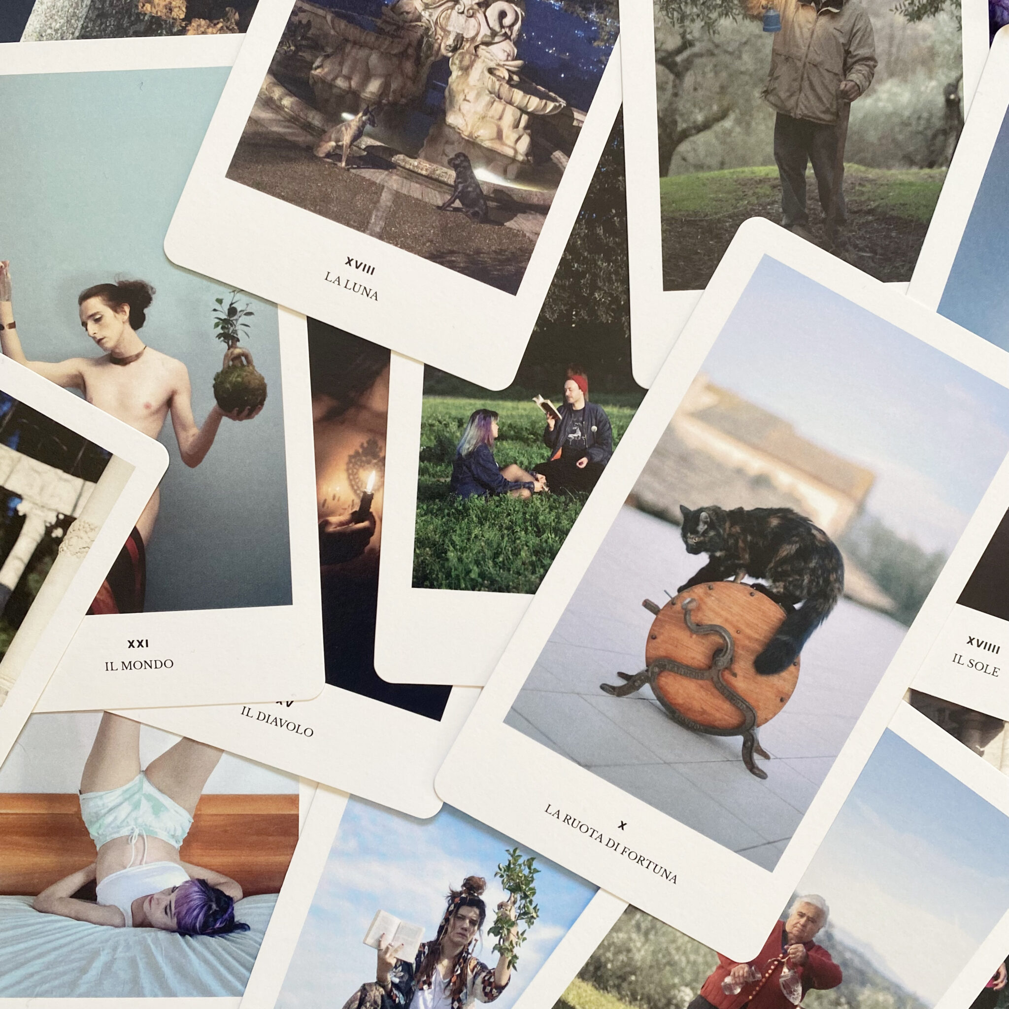 I Tarocchi sono un’arte che non si lascia imprigionare da nessun genere di rigidità: gli Arcani che li compongono sono uno specchio e non una verità di per sé. Sono camaleonti, si trasformano per adattarsi a chi li osserva. Se in essi ci sembra di vedere la nostra vita, è perché l’accostamento delle loro immagini può contenere ogni storia, dunque anche la nostra. Le fotografie che compongono Il Matto è Il Mondo – Tarocchi sono state create camminando attraverso ogni Arcano col fine di restare fedeli e insieme tradire costantemente l’iconografia originaria dei Tarocchi unendo tarologia, stage-photography e diario fotografico. I Trionfi, o Arcani Maggiori, formano una narrazione che condensa in sé tutte le esperienze che un essere umano può vivere nell’arco della propria esistenza poiché espressione di un completo cammino iniziatico. In questo lavoro, attraverso l’immagine fotografica, ci si appropria delle fasi di tale cammino immaginando i Trionfi al di fuori della loro stessa carta. Sono qui resi vivi e fatti di carne, vengono osservati dentro i loro stessi abiti ed oltre il riquadro del foglio che li contiene.