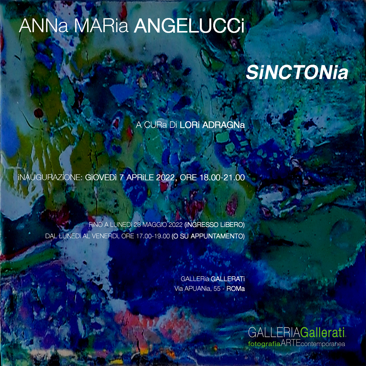 Si inaugura giovedì 7 aprile 2022, alla Galleria Gallerati di Roma, Sinctonia, una mostra personale di Anna Maria Angelucci a cura di Lori Adragna.