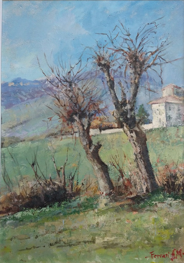 Lo stesso vale per la pittura, forte e vigorosa, libera e potente, scultorea quasi, nel suo prorompente vigore. Così le due forme artistiche, pittura e scultura, finiscono per fondersi e contaminarsi fino a formare un “unicum”, una cosa sola, dove la materia, intesa proprio come spessore, volume e tridimensionalità, è protagonista indiscussa di ogni sua creazione. Allora i suoi stupendi paesaggi, riferiti per lo più alla vallate piacentine, si vestono di una forza prorompente, il colore si fa materia densa e corposa, traccia solchi e avvallamenti, a volte diventa opaco e rugoso come la terra, altre volte, invece, acquista la leggerezza dell'aria e delle nuvole. Pittura che denota forte personalità, sicurezza d'esecuzione e taglio compositivo moderno e contemporaneo. E lo stesso vale anche quando l'artista affronta le tematiche legate alla “figura umana”. I suoi personaggi, infatti, rivelano sempre grande senso plastico, morbidezza e forza espressiva unite, molto spesso, ad una sottile e velata malinconia che li avvolge di una sentita carica poetica.