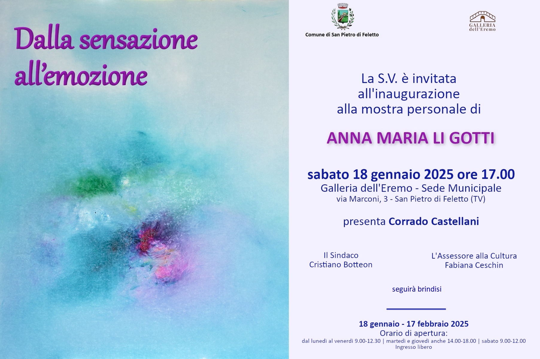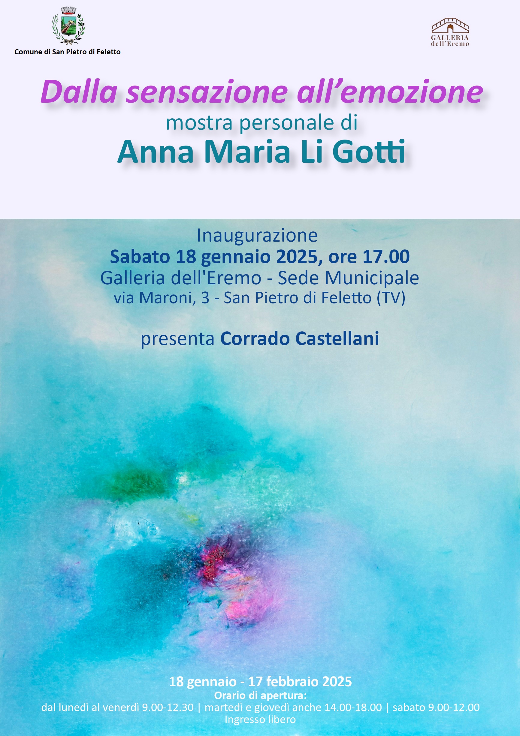 La Galleria dell’Eremo di Rua di Feletto è lieta di presentare la mostra personale di Anna Maria Li Gotti intitolata Dalla sensazione all’emozione, un’artista che sviluppa il linguaggio dell’informale nella direzione di un lirismo soffuso carico di intensità espressiva.