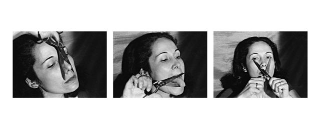 Bocche intrappolate, forbici che tagliano la lingua o il naso, nastri che cingono il volto sono alcune immagini di In e out Antropofagia e É o que Sobra, lavori che tramite gesti forti, seppur semplici, ben evocano la difficoltà di esprimersi e che caratterizzano l’opera dell’artista.