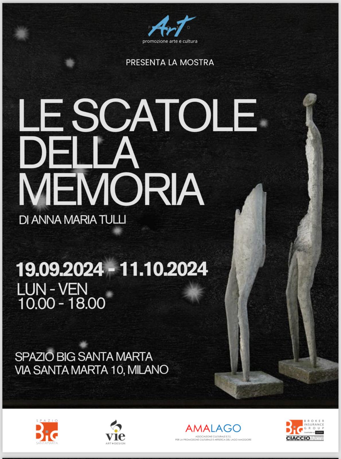 Spazio Big Santa Marta è lieto di annunciare l’inaugurazione della mostra personale dell’artista Anna Maria Tulli, intitolata “Le Scatole della Memoria”. La mostra sarà aperta al pubblico dal 19 settembre 2024 all’11 ottobre 2024.