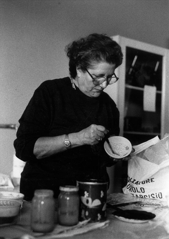 La ceramica fu per la mamma solo l’ultima delle sue sfide di pittrice in ordine di tempo; si dedicò in particolare a ripercorrere i processi produttivi della “graffita” e della “mezza maiolica” rinascimentale, in passato completamente sconosciute, almeno in territorio mantovano. Ogni pezzo nasceva dalle sue mani: l’argilla umida era plasmata, fatta aderire ad una forma, immersa nel bagno di ingobbio, incisa con vari tipi di sgorbia o di spatola, e, una volta asciutta, dipinta nei classici colori verde ramina e giallo ferraccia, invetriata e infine cotta nel forno elettrico alla temperatura sorvegliata attentamente da papà.