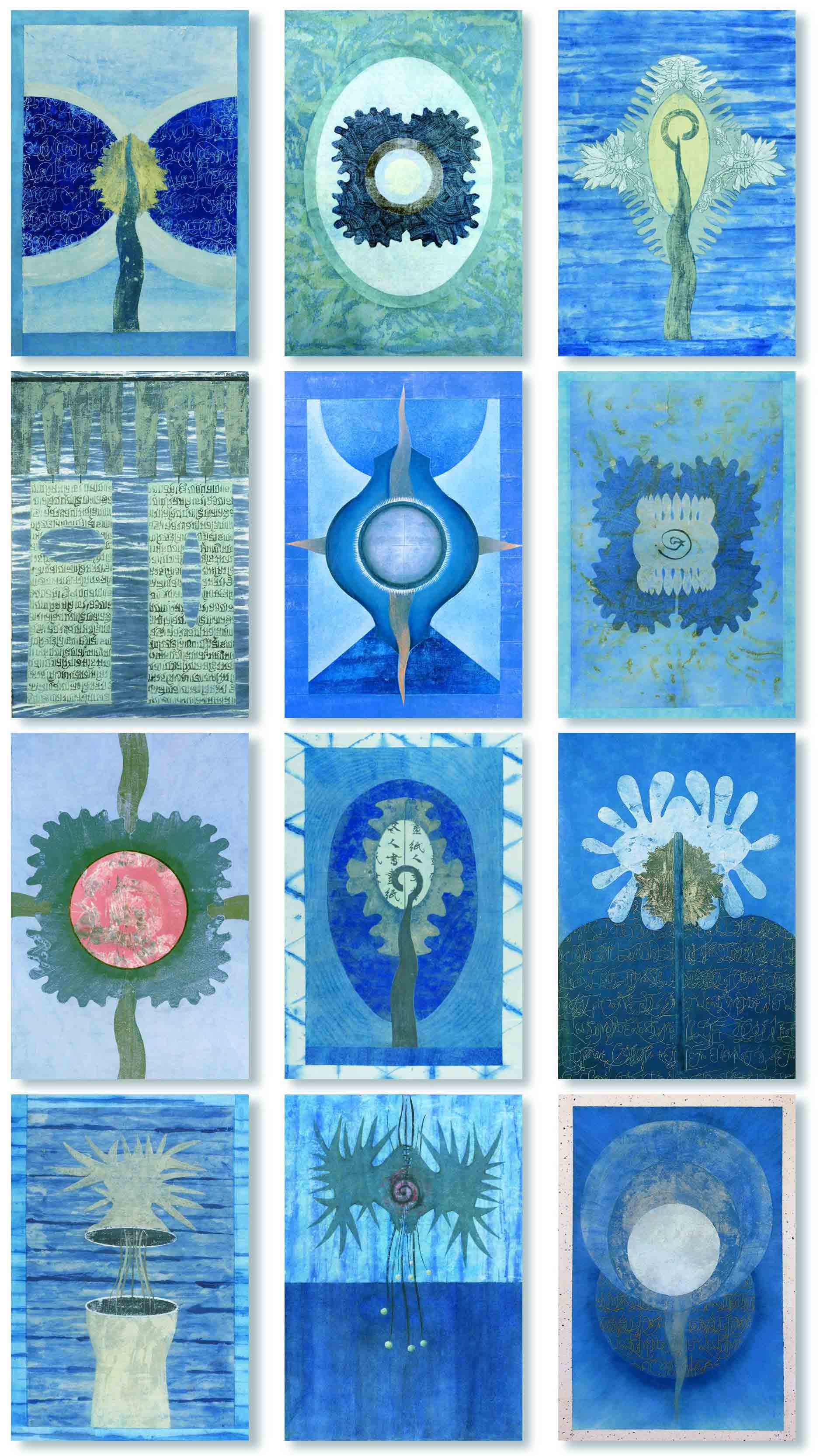 Le opere in mostra, dipinte con colori naturali come l’indaco e il guado, sono caratterizzate dal prevalere del colore Blu, colore con cui l’artista intende raccontare il mare. Il mare descritto in queste opere è il nostro Mediterraneo, luogo a partire dal quale lo sguardo volge verso l’Oriente più vicino e più lontano. Le opere sono state create con carta giapponese e realizzate con tecniche indirette come l’impronta, il ricalco e la piegatura. Queste tecniche hanno permesso all’artista di disegnare forme che si ripetono con una cadenza ritmica carica di risonanze ed echi di un mondo organico, sottomarino, inconscio, fatto di elementi ciliari, di tentacoli, di filamenti, di attinie, di profili di figure umane in precipizio.